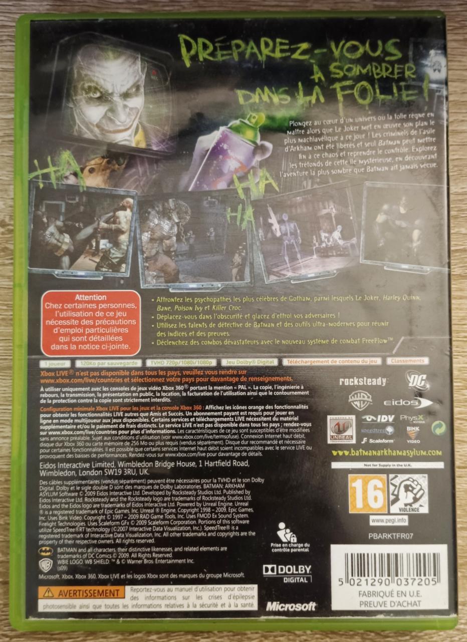 L1 - Batman - Arkham Asylum Xbox 360 / EAN : 5021290037205 - ARTICLE OCCASION EN TRES BON ETAT GENERAL - TEST MACHINE OK - PACK COMPLET - LIVRAISON SUPER RAPIDE EN COLIS SUIVI PROTEGE - COVER FR - CIB