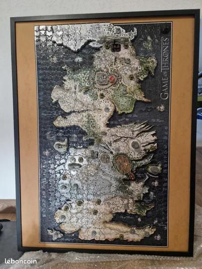 Pour les fans de Game of Thrones . Prét à être poser sur un mur ou autre. Tableau fait avec cadre puzzle collé en relief . Prix intial du puzzle une 50 ène d'euros puzzle rare plus en vente + prix du cadre je ne me souviens pas.