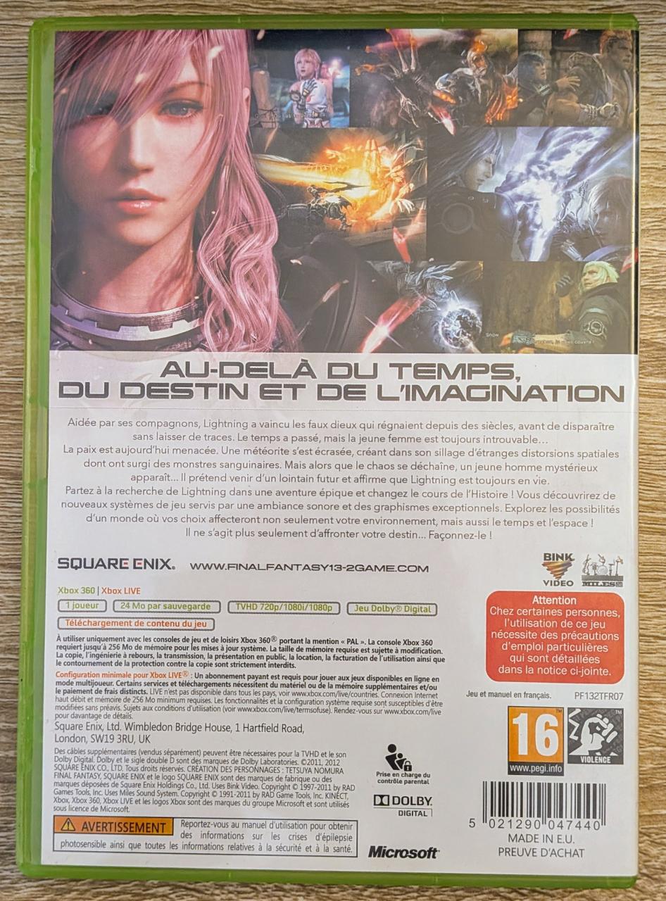 L1 - Final Fantasy Xiii-2 Xbox 360 - EAN : 5021290047440 - ARTICLE OCCASION EN TRES BON ETAT GÉNÉRAL - BOITIER ORIGINAL XBOX 360 - TEST MACINE OK EN LECTURE ET INSTALATION SUR LES 4 VERSION DE XBOX 360 ET XBOX SX - JEUX JOUABLE EN FRANCAIS - LIVRAISON ULTRA RAPIDE EN COLIS SUIVI PROTÈGE - COVER FR - ENTIEREMENT RETRO COMPATIBLE XBOX SERIES X ET ONE X