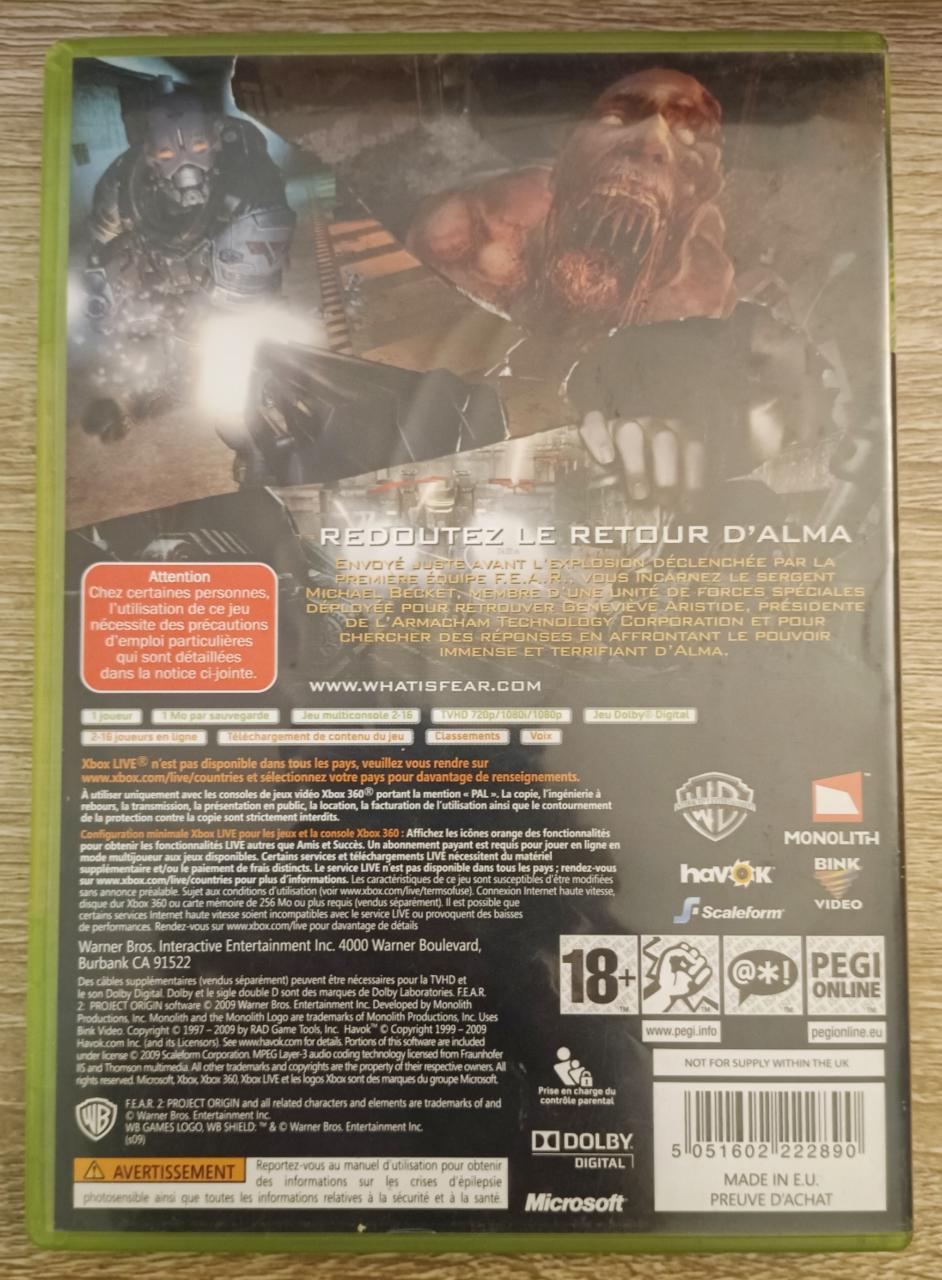 L2 - F.E.A.R. 2 - Project Origin Xbox 360 - EAN : 5051602222890 - ARTICLE OCCASION EN TRES BON ETAT GÉNÉRAL - TEST MACHINE OK - BOITIER ORIGINAL XBOX 360 - JEUX JOUABLE EN FRANCAIS - LIVRAISON ULTRA RAPIDE EN COLIS SUIVI PROTÈGE - COVER FR - rétrocompatible : Il est jouable sur Xbox One et Xbox Series X