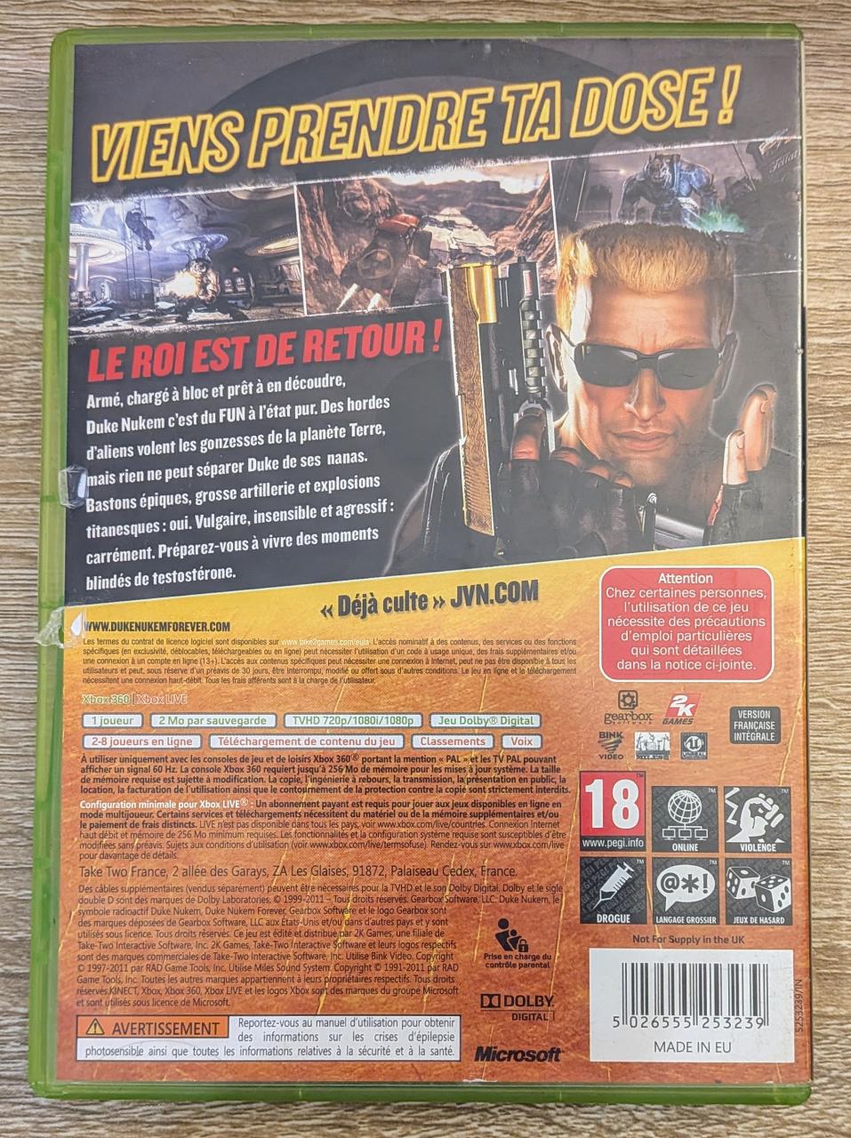 L1 - Duke Nukem Forever Xbox 360 - EAN : 5026555253239 - ARTICLE OCCASION EN TRES BON ETAT GÉNÉRAL - TEST MACINE OK - BOITIER ORIGINAL XBOX 360 - JEUX JOUABLE EN FRANCAIS - LIVRAISON ULTRA RAPIDE EN COLIS SUIVI PROTÈGE - COVER FR - COMPLET CIB - RETRO COMPATIBLE A 100% AVEC LA XBOX SX