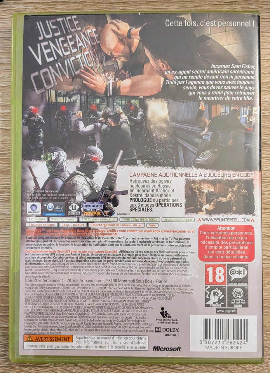 L3 - Tom Clancy's Splinter Cell - Conviction Xbox 360 - EAN : 3307210262424 - ARTICLE OCCASION EN TRES BON ETAT GÉNÉRAL - TEST MACINE OK - BOITIER ORIGINAL XBOX 360 - JEUX JOUABLE EN FRANCAIS - LIVRAISON ULTRA RAPIDE EN COLIS SUIVI PROTÈGE - COVER FR - COMPLET CIB - RETRO COMPATIBLE A 100% AVEC LA XBOX SX