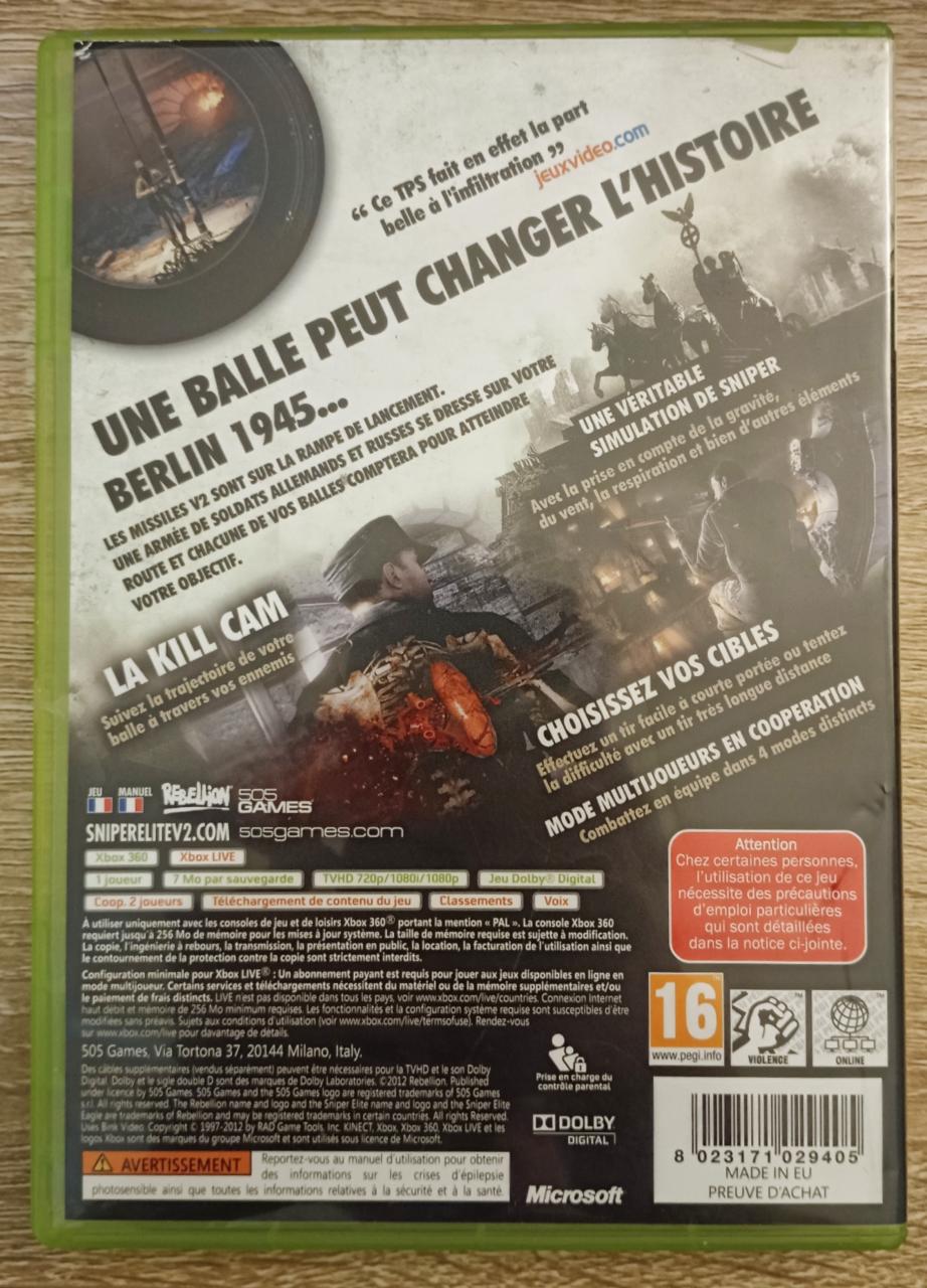 L3 - Sniper Elite V2 Xbox 360 - EAN : 8023171029405 - ARTICLE OCCASION EN TRES BON ETAT GÉNÉRAL - TEST MACHINE OK - BOITIER ORIGINAL XBOX 360 - JEUX JOUABLE EN FRANCAIS - LIVRAISON ULTRA RAPIDE EN COLIS SUIVI PROTÈGE - COVER FR - COMPLET CIB - Parfaitement rétrocompatible avec la Xbox Series X
