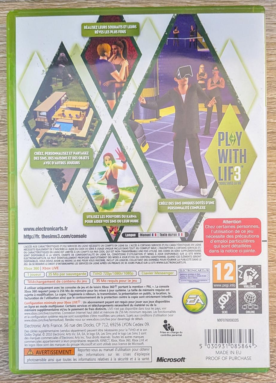 L3 - Les Sims 3 Xbox 360 - EAN : 5030931085864 - ARTICLE OCCASION EN TRES BON ETAT GÉNÉRAL - TEST SUR CONSOLE ( Core , Elite , Arcade , 360 S , Xbox 360 E ) BOITIER ORIGINAL XBOX 360 - JEUX JOUABLE EN FRANCAIS - LIVRAISON ULTRA RAPIDE EN COLIS SUIVI PROTÈGE - COVER FR - COMPLET CIB