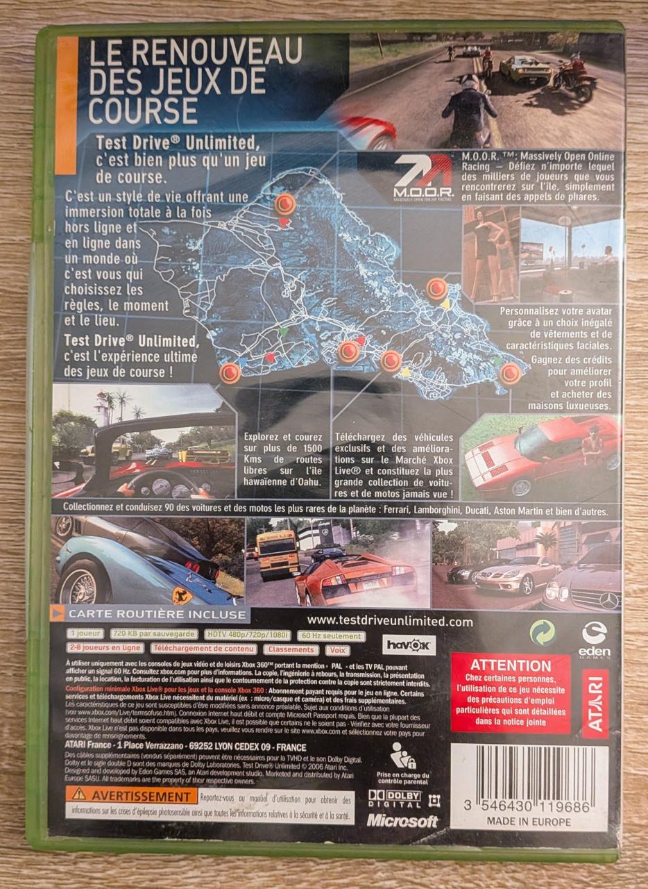 L3 - Test Drive Unlimited Xbox 360 - EAN : 3546430119686 - ARTICLE OCCASION EN TRES BON ETAT GÉNÉRAL - BOITIER ORIGINAL XBOX 360 - JEUX JOUABLE EN FRANCAIS - LIVRAISON ULTRA RAPIDE EN COLIS SUIVI PROTÈGE - COVER FR - COMPLET CIB