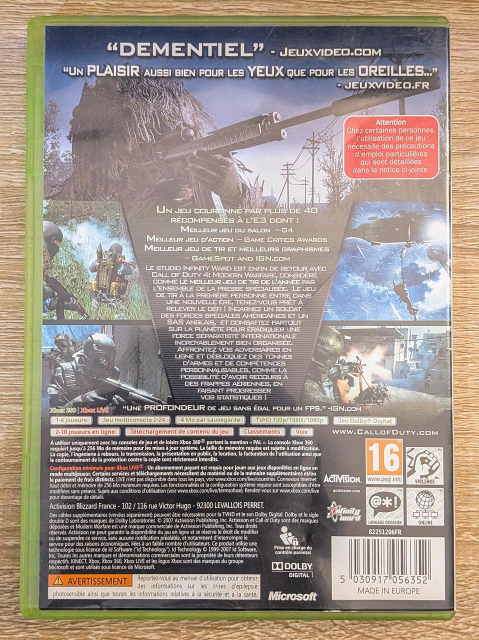 L1 - Call Of Duty 4 - Modern Warfare - Classics Edition Xbox 360 - EAN : 5030917056352 - ARTICLE OCCASION EN TRES BON ETAT GÉNÉRAL - BOITIER ORIGINAL XBOX 360 - JEUX JOUABLE EN FRANCAIS - LIVRAISON ULTRA RAPIDE EN COLIS SUIVI PROTÈGE - COVER FR - COMPLET