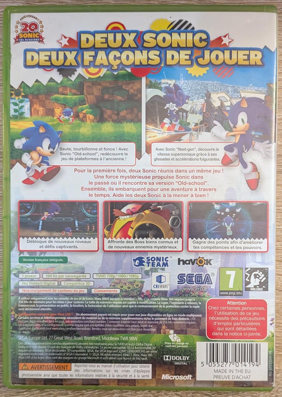 L2 - Sonic Generations Xbox 360 - EAN : 5055277014194 - ARTICLE OCCASION EN TRES BON ETAT GÉNÉRAL - TEST SUR CONSOLE ( Core , Elite , Arcade , 360 S , Xbox 360 E , Xbox SX ) BOITIER ORIGINAL XBOX 360 - JEUX JOUABLE EN FRANCAIS - LIVRAISON ULTRA RAPIDE EN COLIS SUIVI PROTÈGE - COVER FR - 100% Rétro-compatible Xbox Series X avec Auto HDR et Boost FPS