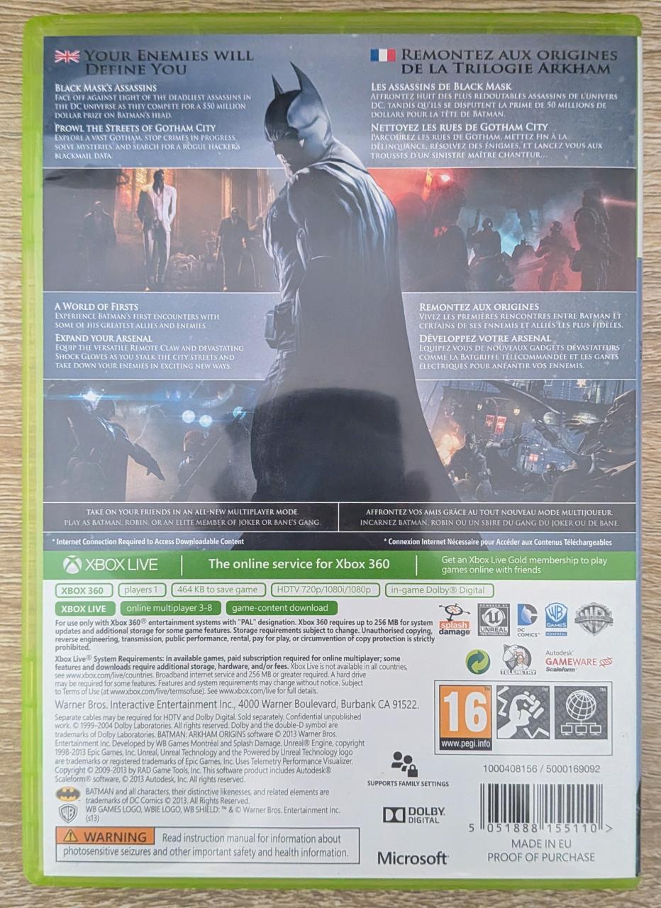 L1 - Batman - Arkham Origins Xbox 360 - EAN : 5051888155110 / 5051888155110 - ARTICLE OCCASION EN TRES BON ETAT GÉNÉRAL - BOITIER ORIGINAL XBOX 360 - JEUX JOUABLE EN FRANCAIS - LIVRAISON ULTRA RAPIDE EN COLIS SUIVI PROTÈGE - COVER FR - COMPLET