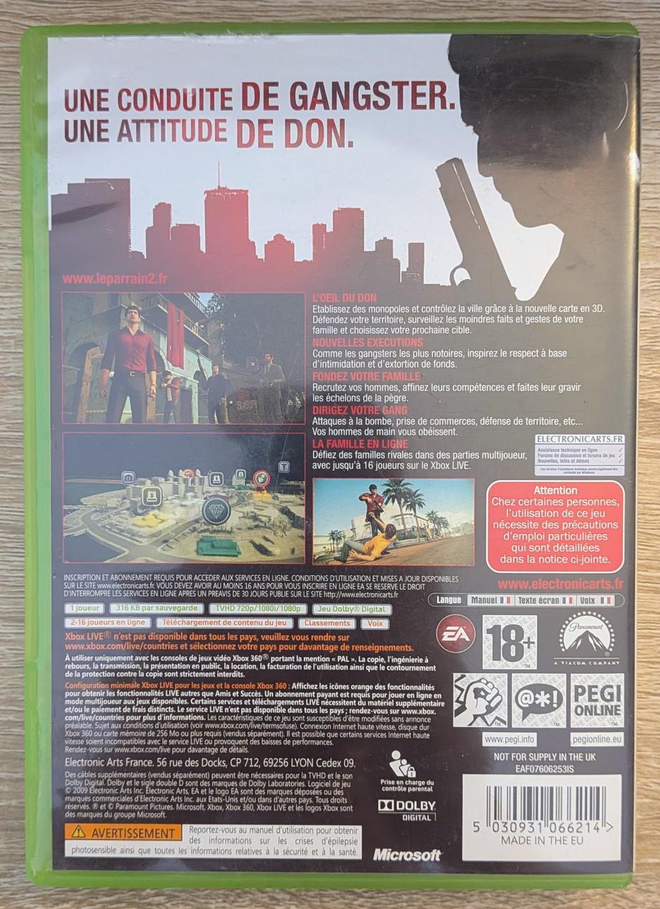 L3 - Le Parrain Ii Xbox 360 - EAN : 5030931066214 - ARTICLE OCCASION EN TRES BON ETAT GÉNÉRAL - TEST SUR CONSOLE ( Core , Elite , Arcade , 360 S , Xbox 360 E ) OK - BOITIER ORIGINAL XBOX 360 - JEUX JOUABLE EN FRANCAIS - LIVRAISON ULTRA RAPIDE EN COLIS SUIVI PROTÈGE - COVER E.U - COMPLET CIB - NON RETRO COMPATIBLE SX