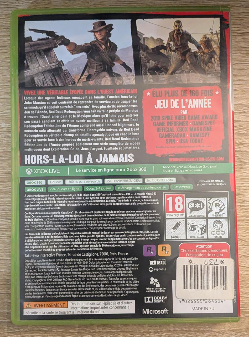 L1 - Red Dead Redemption - Game Of The Year Xbox 360 - EAN : 5026555264334 - ARTICLE OCCASION EN TRES BON ETAT GÉNÉRAL - TEST MACHINE OK - BOITIER ORIGINAL XBOX 360 - JEUX JOUABLE EN FRANCAIS - LIVRAISON ULTRA RAPIDE EN COLIS SUIVI PROTÈGE - COVER FR - COMPLET CIB - 100% RETRO COMPATIBLE SX