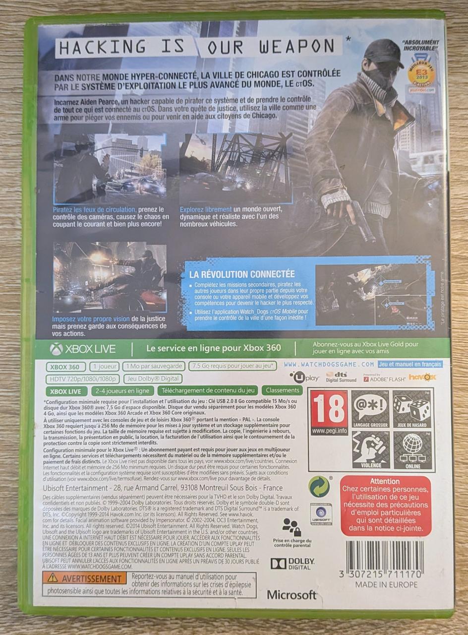 L1 - Watch Dogs Xbox 360 - EAN : 3307215711170 - ARTICLE OCCASION EN TRES BON ETAT GÉNÉRAL - BOITIER ORIGINAL XBOX 360 - JEUX JOUABLE EN FRANCAIS - TEST SUR CONSOLE ( Core , Elite , Arcade , 360 S , Xbox 360 E ) OK - LIVRAISON ULTRA RAPIDE EN COLIS SUIVI PROTÈGE - COVER FR - SANS DOCUMENTATION - Rétrocompatibilité Xbox Series X pour profiter de Auto HDR et du Boost FPS