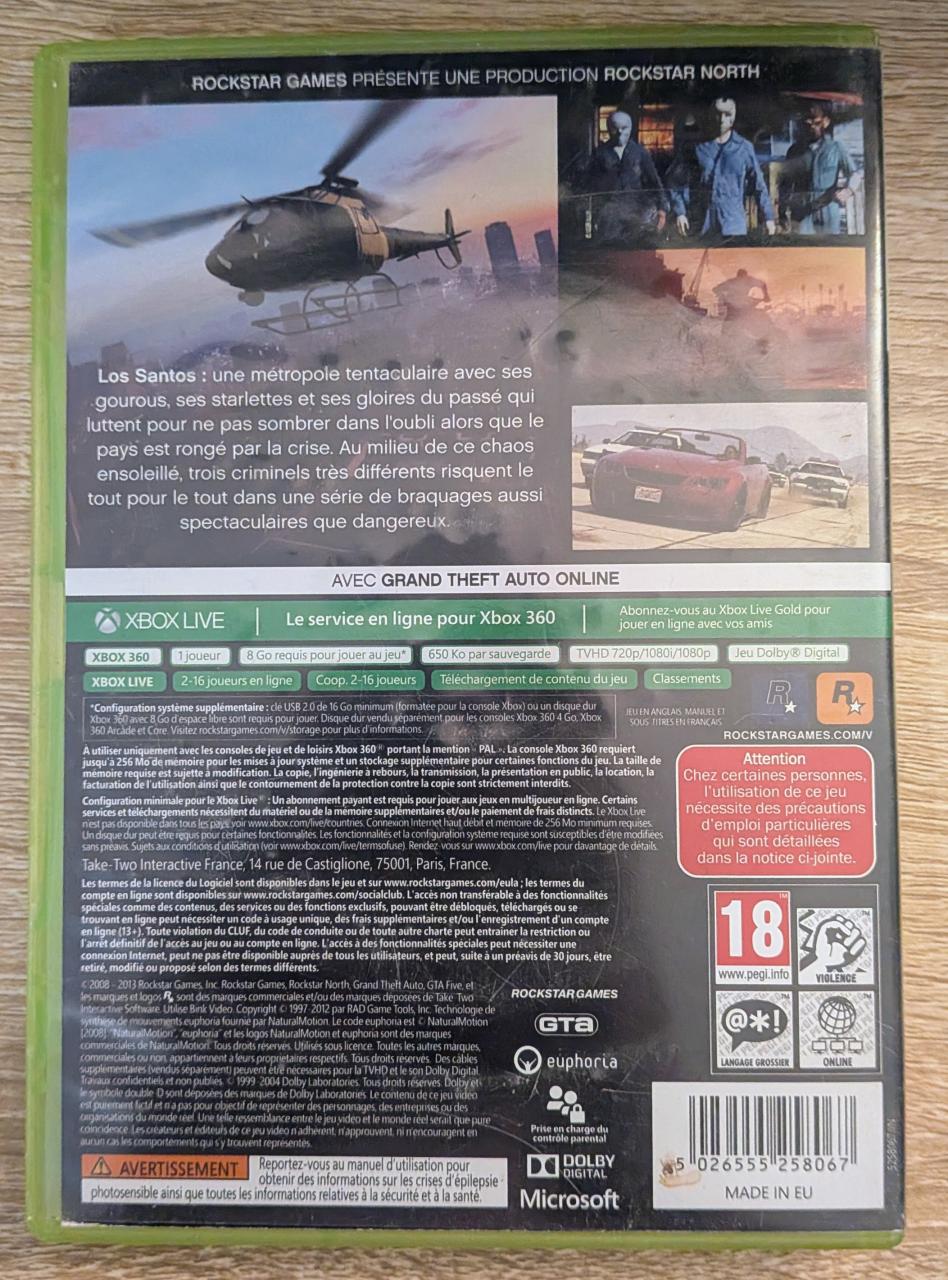 L2 - Grand Theft Auto V Xbox 360 - EAN : 5026555258067 - ARTICLE OCCASION EN TRES BON ETAT GÉNÉRAL - TEST SUR CONSOLE ( Core , Elite , Arcade , 360 S , Xbox 360 E , Xbox SX ) BOITIER ORIGINAL XBOX 360 - JEUX JOUABLE EN FRANCAIS - LIVRAISON ULTRA RAPIDE EN COLIS SUIVI PROTÈGE - COVER FR - 100% Rétro-compatible Xbox Series X avec Auto HDR et Boost FPS