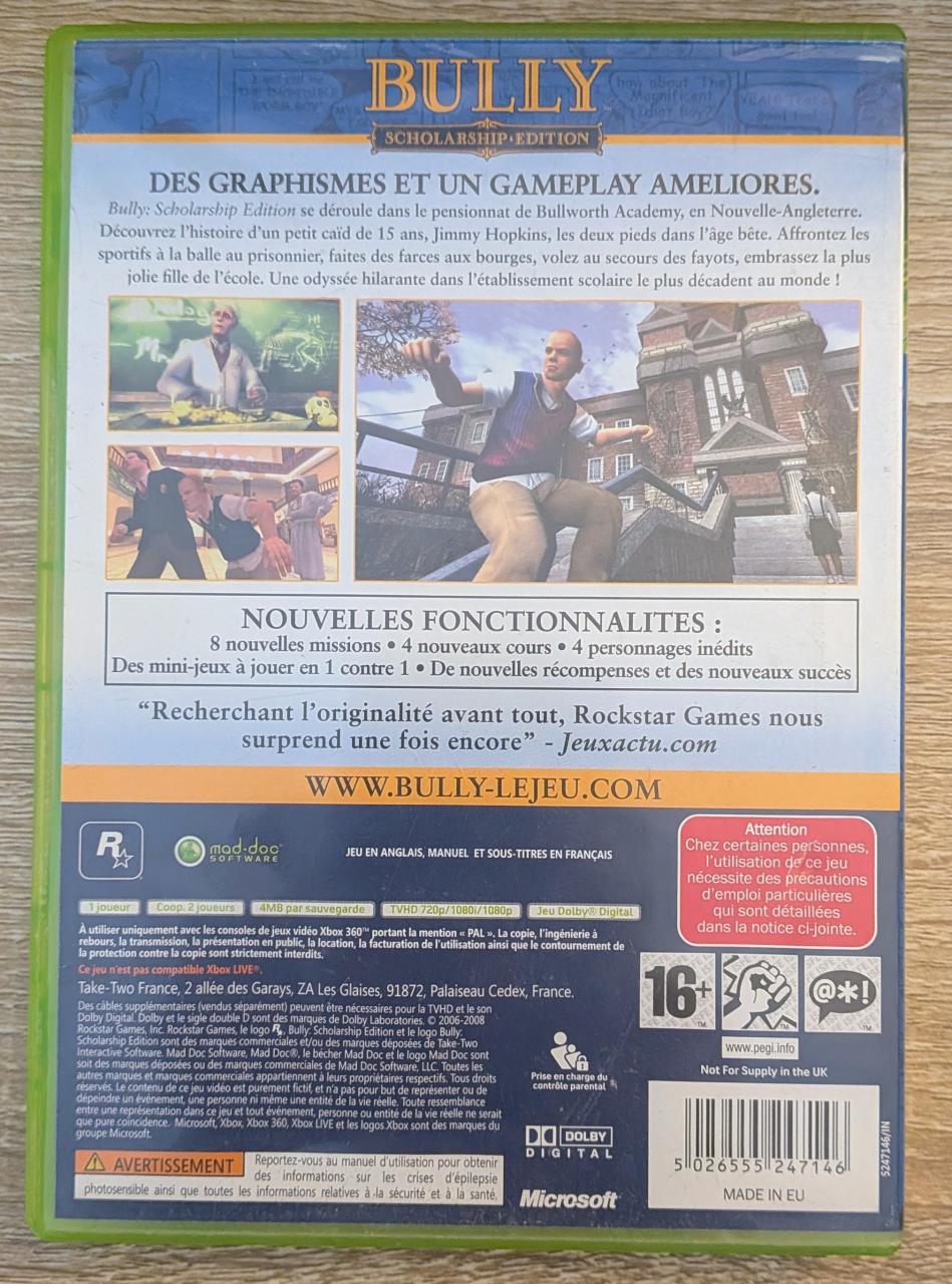 L2 - Bully - Scholarship Editon Xbox 360 - EAN : 5026555247146 - ARTICLE OCCASION EN TRES BON ETAT GÉNÉRAL - TEST SUR CONSOLE ( Core , Elite , Arcade , 360 S , Xbox 360 E , Xbox SX ) BOITIER ORIGINAL XBOX 360 - JEUX JOUABLE EN FRANCAIS - LIVRAISON ULTRA RAPIDE EN COLIS SUIVI PROTÈGE - COVER FR - 100% Rétro-compatible Xbox Series X avec Auto HDR et Boost FPS