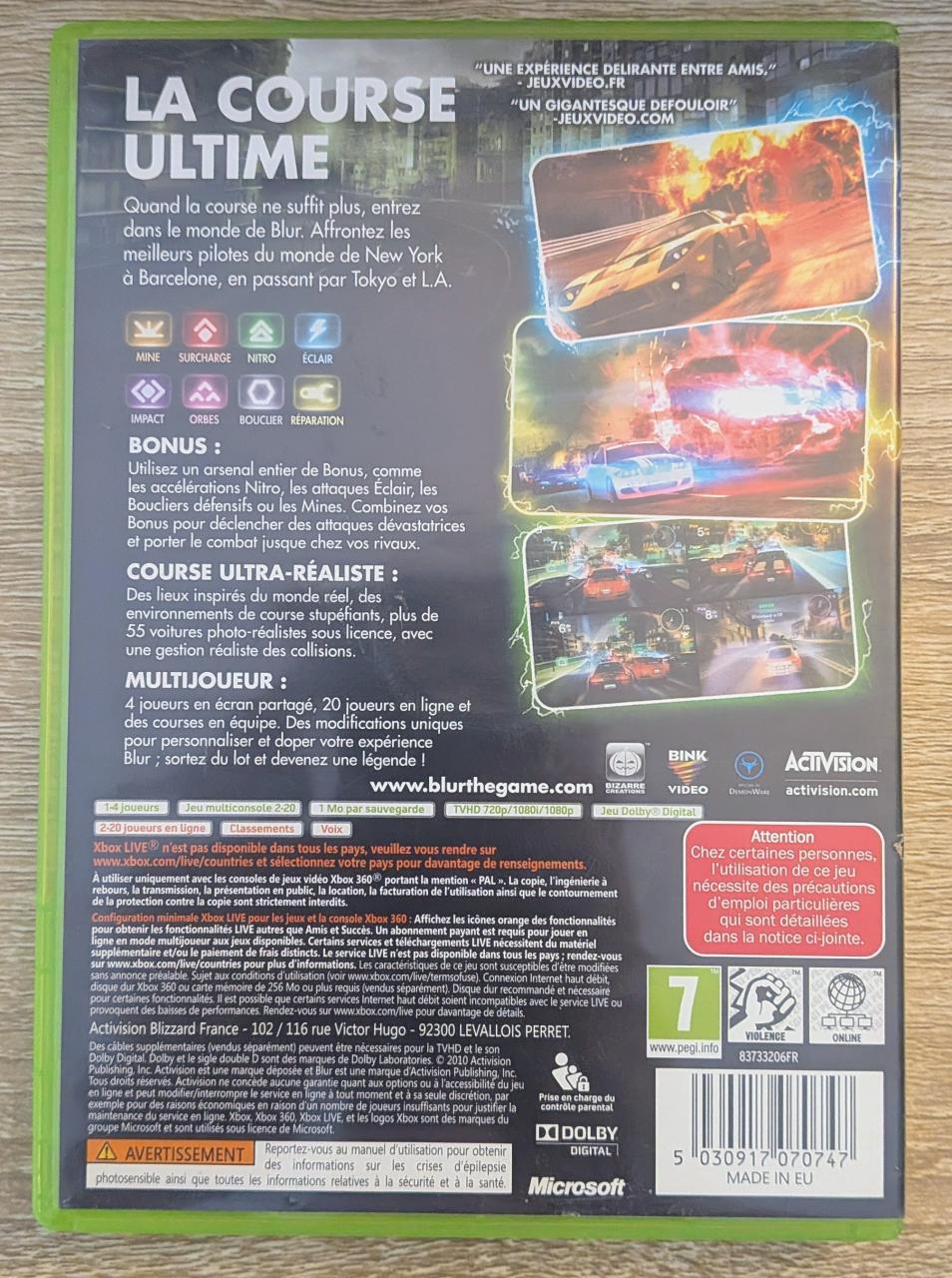 L1 - Blur Xbox 360 - EAN : 5030917070747 / 83733206FR - ARTICLE OCCASION EN TRES BON ETAT GÉNÉRAL - TEST SUR CONSOLE ( Core , Elite , Arcade , 360 S , Xbox 360 E ) OK - BOITIER ORIGINAL XBOX 360 - JEUX JOUABLE EN FRANCAIS - LIVRAISON ULTRA RAPIDE EN COLIS SUIVI PROTÈGE - COVER FR - COMPLET CIB
