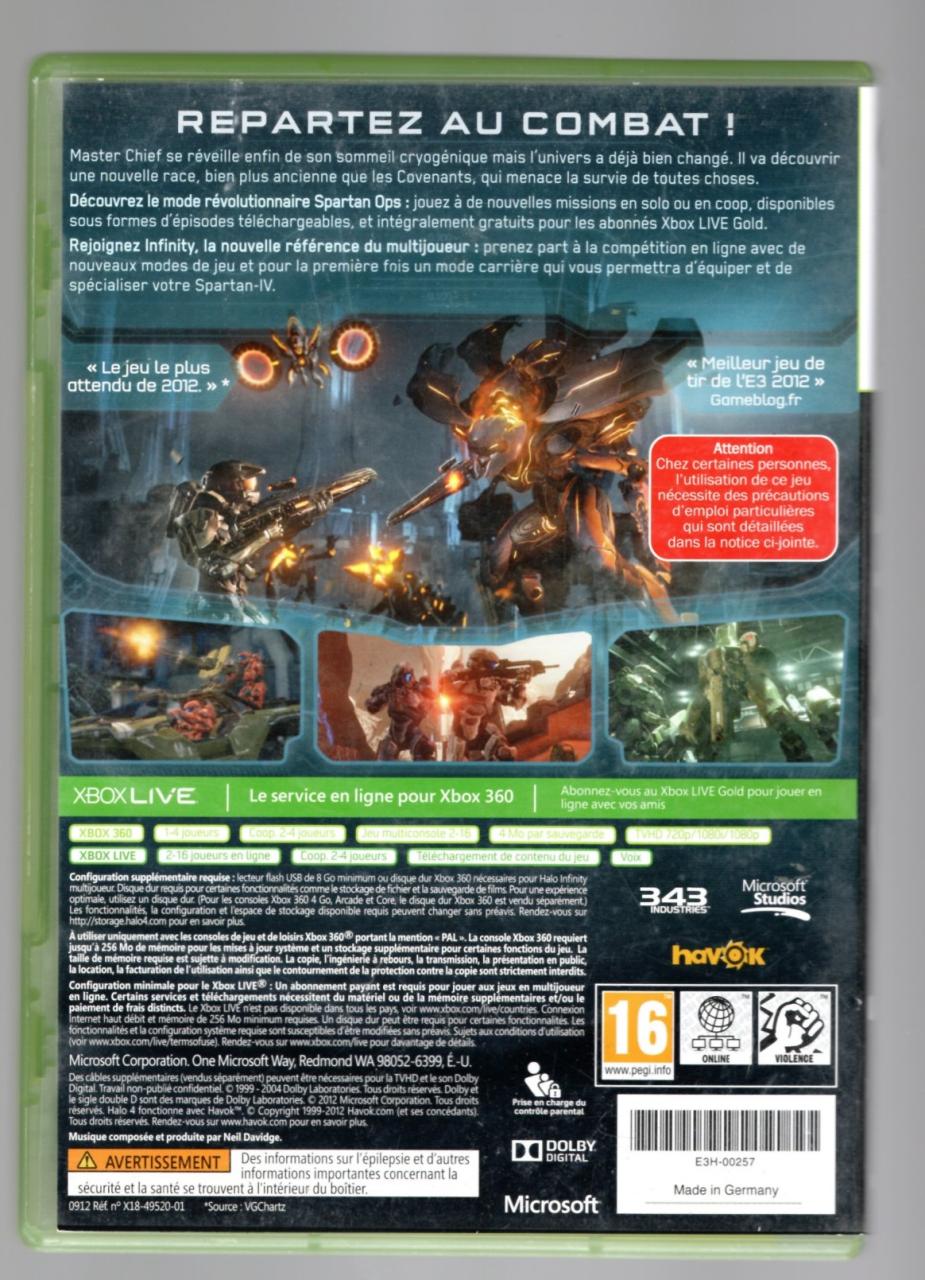 L1 - Halo 4 Xbox 360 - EAN : 885370439908 / E3H-00257 - ARTICLE OCCASION EN TRES BON ETAT GÉNÉRAL - BOITIER ORIGINAL XBOX 360 - JEUX JOUABLE EN FRANCAIS - LIVRAISON ULTRA RAPIDE EN COLIS SUIVI PROTÈGE - COVER FR