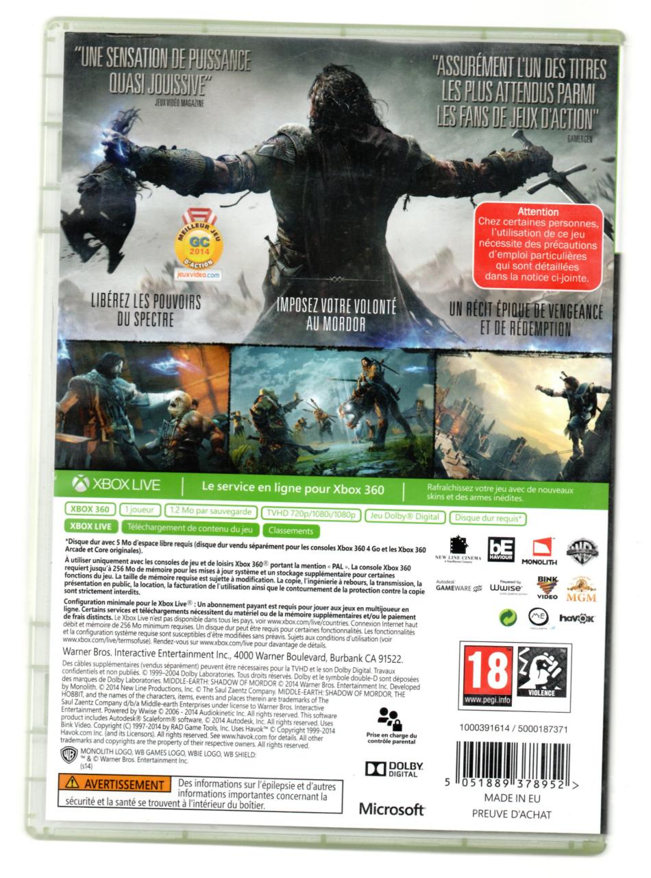 L2 - La Terre Du Milieu - L'ombre Du Mordor Xbox 360 - EAN : 5051889378952- ARTICLE OCCASION EN TRES BON ETAT GÉNÉRAL - TEST SUR CONSOLE ( Core , Elite , Arcade , 360 S , Xbox 360 E , Xbox SX ) BOITIER ORIGINAL XBOX 360 - JEUX JOUABLE EN FRANCAIS - LIVRAISON ULTRA RAPIDE EN COLIS SUIVI PROTÈGE - COVER FR
