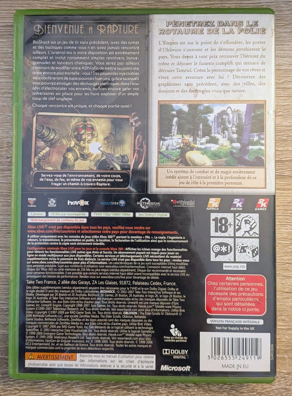 L2 - Duo : The Eelder Scrolls Iv - Oblivion + Bioshock Xbox 360 - EAN : 5026555249119 - ARTICLE OCCASION EN TRES BON ETAT GÉNÉRAL - TEST SUR CONSOLE ( Core , Elite , Arcade , 360 S , Xbox 360 E , Xbox SX ) BOITIER ORIGINAL XBOX 360 - JEUX JOUABLE EN FRANCAIS - LIVRAISON ULTRA RAPIDE EN COLIS SUIVI PROTÈGE - COVER FR - COMPLET