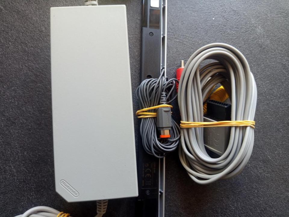 Console Nintendo Wii vendue avec ses câbles secteur, péritel et sensor barre en état correct.