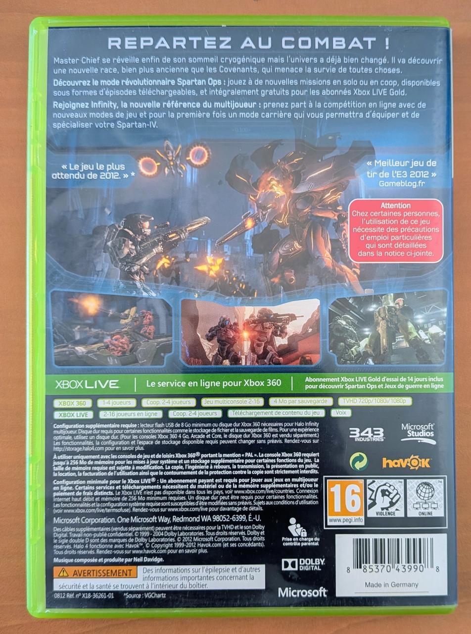 L3 - Halo 4 Xbox 360 - EAN : 885370439908 - ARTICLE OCCASION EN TRES BON ETAT GÉNÉRAL - TEST SUR CONSOLE ( Core , Elite , Arcade , 360 S , Xbox 360 E ) OK - BOITIER ORIGINAL XBOX 360 - JEUX JOUABLE EN FRANCAIS - LIVRAISON ULTRA RAPIDE EN COLIS SUIVI PROTÈGE - COVER FR - COMPLET CIB
