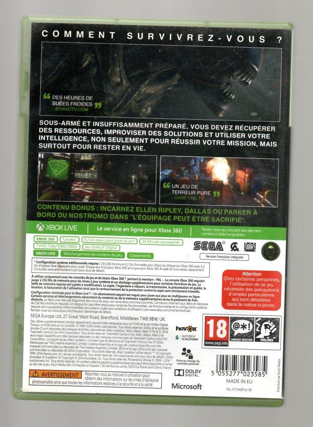 L3 - Aliens - Isolation Xbox 360 - EAN : 5055277023585 - ARTICLE OCCASION EN TRES BON ETAT GÉNÉRAL - TEST SUR CONSOLE ( Core , Elite , Arcade , 360 S , Xbox 360 E ) OK - BOITIER ORIGINAL XBOX 360 - JEUX JOUABLE EN FRANCAIS - LIVRAISON ULTRA RAPIDE EN COLIS SUIVI PROTÈGE - COVER FR - COMPLET CIB
