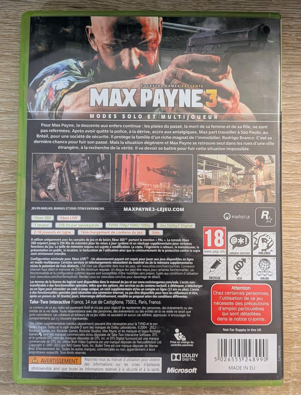 L2 - Max Payne 3 Xbox 360 - EAN : 5026555248990 - ARTICLE OCCASION EN TRES BON ETAT GÉNÉRAL - TEST SUR CONSOLE ( Core , Elite , Arcade , 360 S , Xbox 360 E , Xbox SX ) BOITIER ORIGINAL XBOX 360 - JEUX JOUABLE EN FRANCAIS - LIVRAISON ULTRA RAPIDE EN COLIS SUIVI PROTÈGE - COVER FR