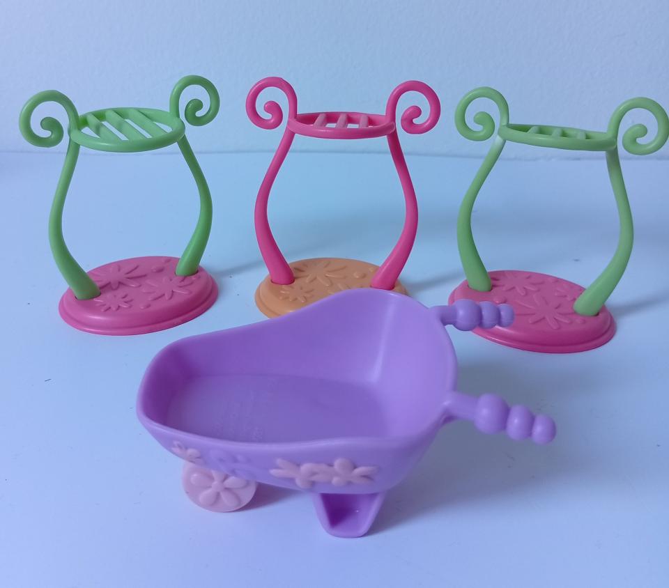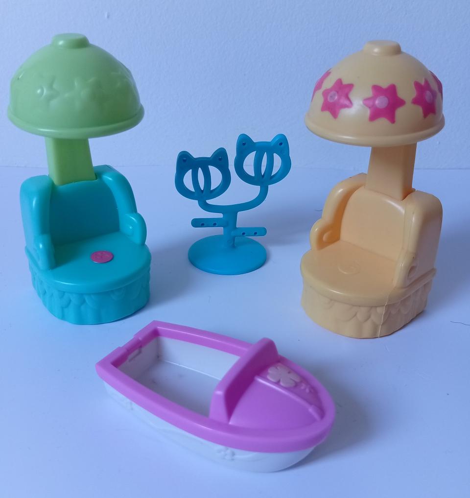 1 Rampe de skateboard bleu turquoise, 1 Bateau rose et blanc, 1 Socle Terre avec pieds de carotte, 1 Panier jaune pour 969 (serpent), 1 Calèche vert roue rose pour 337, 338, 339 et 1 Devanture Maison bambou - Hasbro 2008 C-031