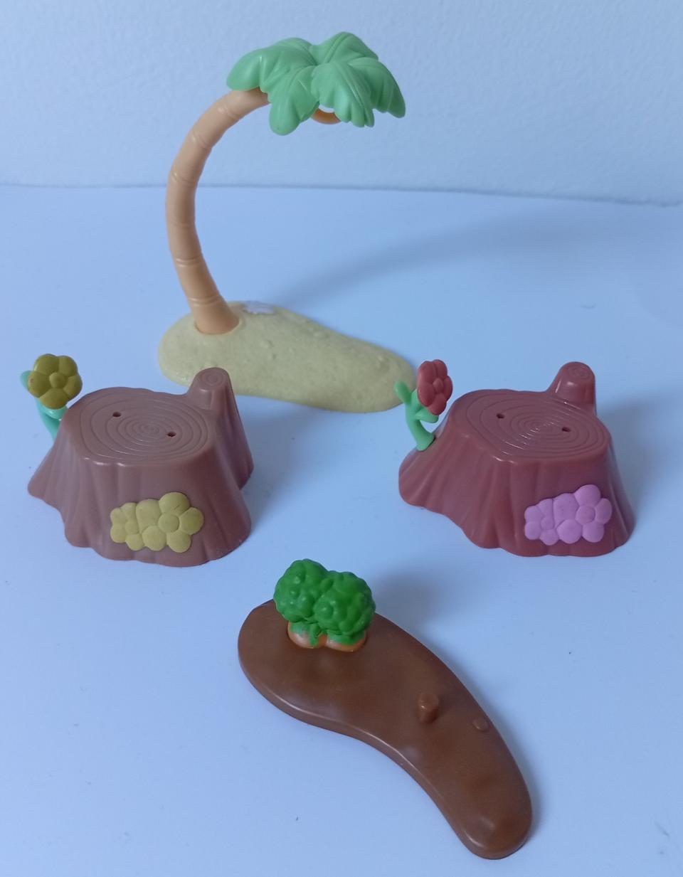 2 socles souches d’arbre (avec 1 fleur jaune et l’autre avec 1 fleur rose saumon), 1 Brouette plastique violette et 1 Bac à sable saumon, château bleu - Hasbro 2006 C-031