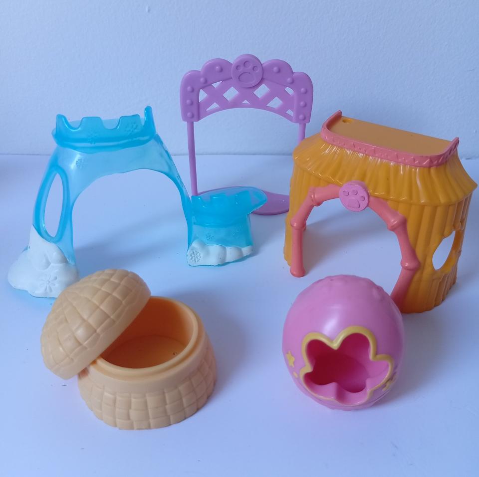Divers accessoire surprise dont Sac Rose, Cerceau de spectacle rose pour chien, 2 balançoires à Pneu de taille différente (couleur violet et jaune/orange) pour LPS79, 1 Socle hivernal LPS, 1 fauteuil vert, 1 Coiffeuse rose, 2 fauteuils pour salon de coiffure (1 jaune et 1 vert), 1 Microphone violet, …
