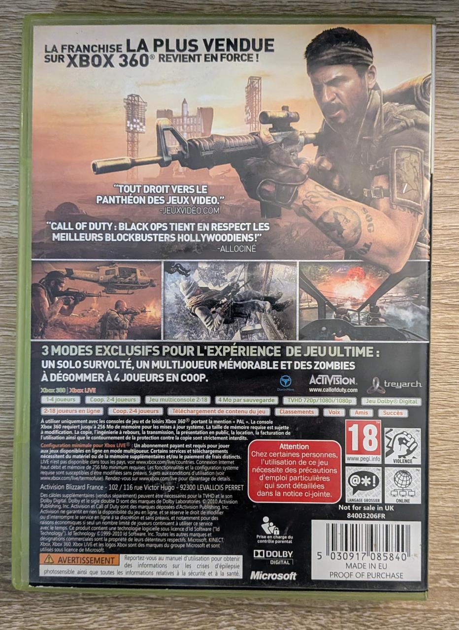 L2 - Call Of Duty Black Ops Xbox 360 - EAN : 5030917085840 - ARTICLE OCCASION EN TRES BON ETAT GÉNÉRAL - TEST SUR CONSOLE ( Core , Elite , Arcade , 360 S , Xbox 360 E , Xbox SX ) BOITIER ORIGINAL XBOX 360 - JEUX JOUABLE EN FRANCAIS - LIVRAISON ULTRA RAPIDE EN COLIS SUIVI PROTÈGE - COVER FR - COMPLET CIB