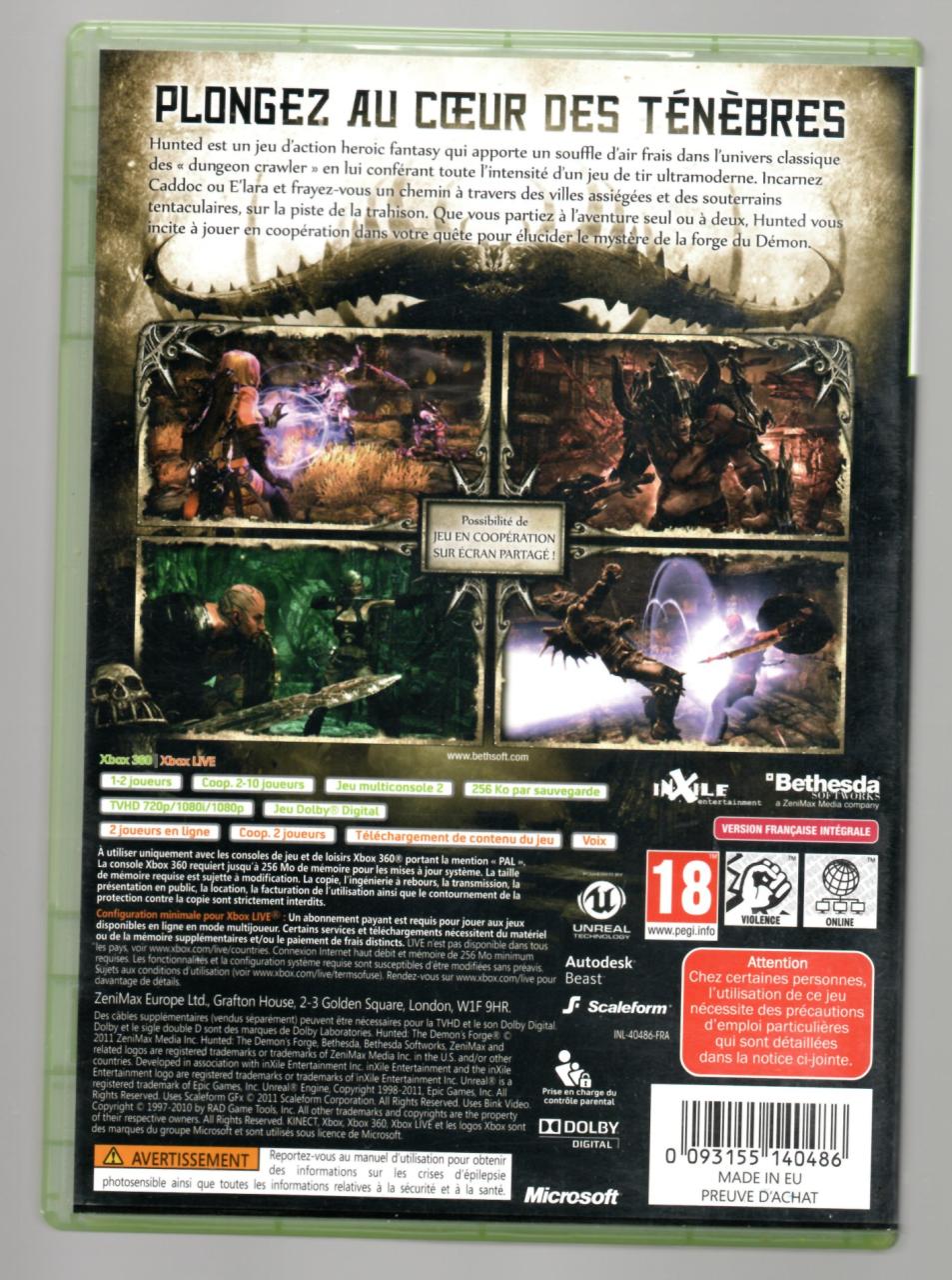 L2 - Hunted - The Demon's Forge Xbox 360 - EAN : 093155140486 - ARTICLE OCCASION EN TRES BON ETAT GÉNÉRAL - TEST SUR CONSOLE ( Core , Elite , Arcade , 360 S , Xbox 360 E , Xbox SX ) BOITIER ORIGINAL XBOX 360 - JEUX JOUABLE EN FRANCAIS - LIVRAISON ULTRA RAPIDE EN COLIS SUIVI PROTÈGE - COVER FR - COMPLET CIB