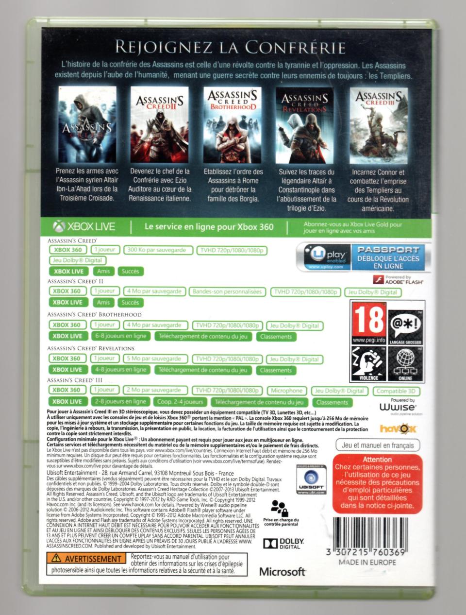 L2 - Assassin's Creed - Heritage Collection Xbox 360 - EAN : 3307215760369 - ARTICLE OCCASION EN TRES BON ETAT GÉNÉRAL - TEST SUR CONSOLE ( Core , Elite , Arcade , 360 S , Xbox 360 E , Xbox SX ) BOITIER ORIGINAL XBOX 360 - JEUX JOUABLE EN FRANCAIS - LIVRAISON ULTRA RAPIDE EN COLIS SUIVI PROTÈGE - COVER FR - COMPLET CIB