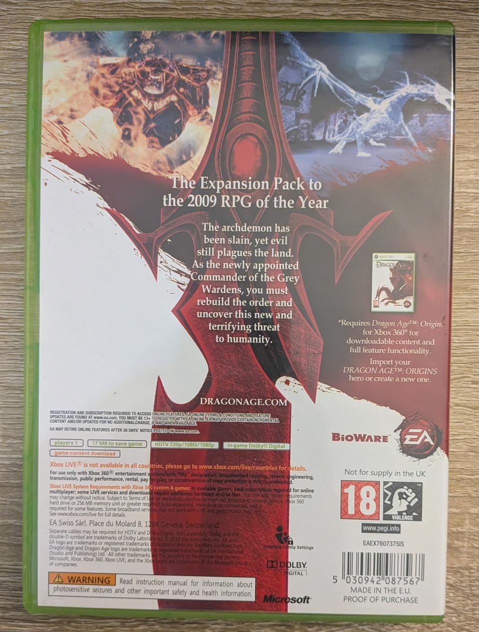L2 - Dragon Age Origins - Awakening Xbox 360 Expension Pack - EAN : 5030942087567 - ARTICLE OCCASION EN TRES BON ETAT GÉNÉRAL - TEST SUR CONSOLE ( Core , Elite , Arcade , 360 S , Xbox 360 E , Xbox SX ) BOITIER ORIGINAL XBOX 360 - JEUX JOUABLE EN FRANCAIS - LIVRAISON ULTRA RAPIDE EN COLIS SUIVI PROTÈGE - COVER E.U - COMPLET CIB