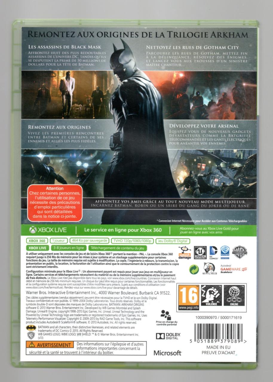 L3 - Batman - Arkham Origins Xbox 360 - EAN : 5051889379089 - ARTICLE OCCASION EN TRES BON ETAT GÉNÉRAL - TEST SUR CONSOLE ( Core , Elite , Arcade , 360 S , Xbox 360 E ) OK - BOITIER ORIGINAL XBOX 360 - JEUX JOUABLE EN FRANCAIS - LIVRAISON ULTRA RAPIDE EN COLIS SUIVI PROTÈGE - COVER E.U - COMPLET CIB - Rétrocompatibilité Xbox Series X pour profiter de Auto HDR et du Boost FPS