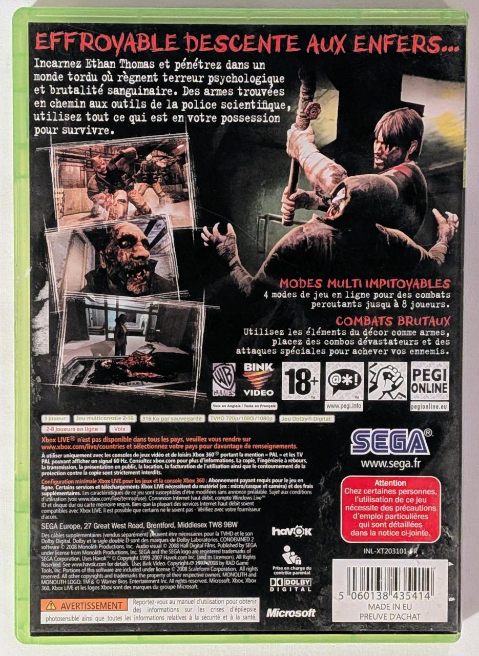 L3 - Condemned 2 Xbox 360 - EAN : 5060138435414 - ARTICLE OCCASION EN TRES BON ETAT GÉNÉRAL - TEST SUR CONSOLE ( Core , Elite , Arcade , 360 S , Xbox 360 E , SX ) OK - BOITIER ORIGINAL XBOX 360 - JEUX JOUABLE EN FRANCAIS - LIVRAISON ULTRA RAPIDE EN COLIS SUIVI PROTÈGE - COVER FR - COMPLET CIB