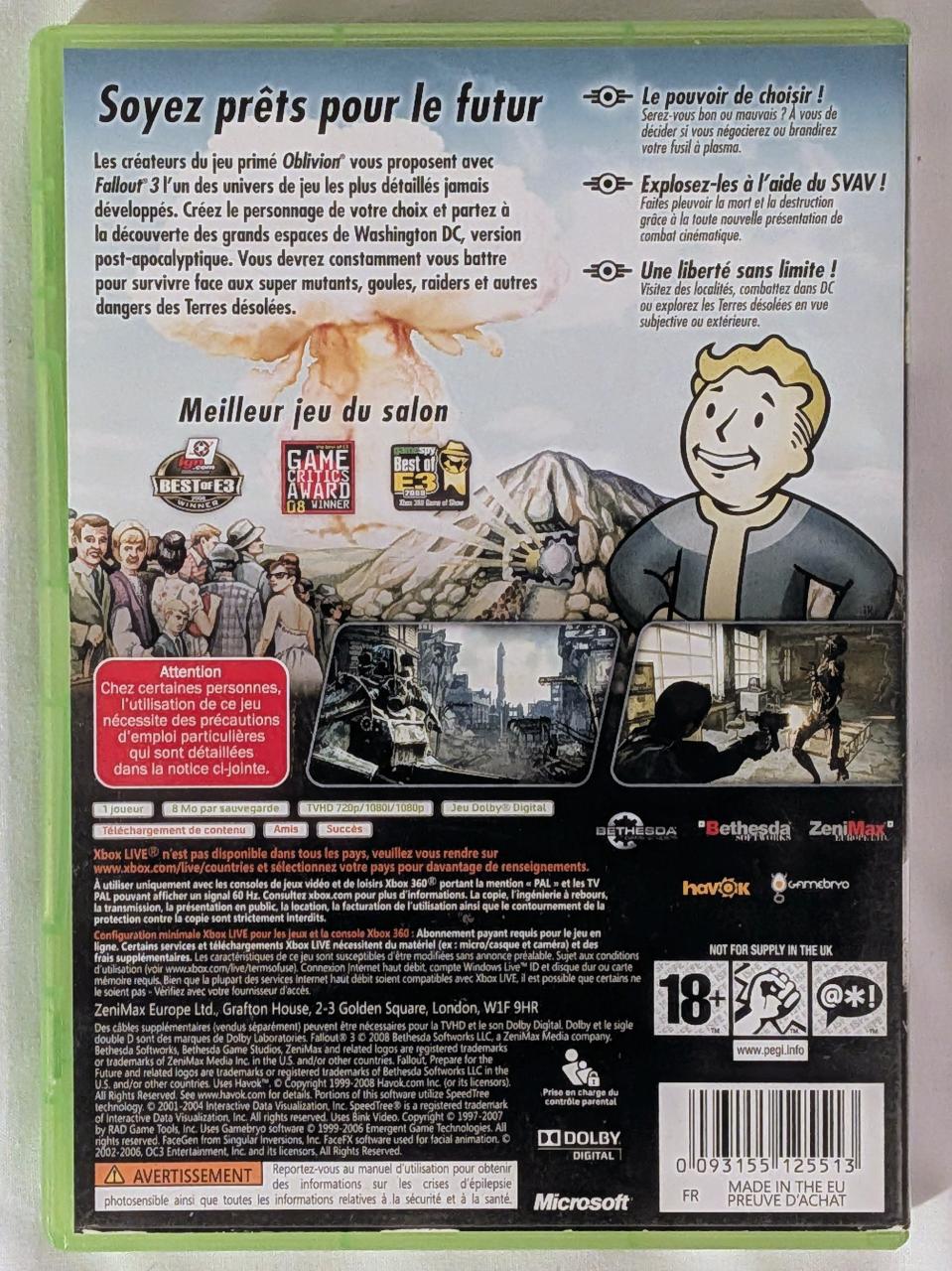 L3 - Fallout 3 Xbox 360 - EAN : 0093155125513 - ARTICLE OCCASION EN TRES BON ETAT GÉNÉRAL - TEST SUR CONSOLE ( Core , Elite , Arcade , 360 S , Xbox 360 E , SX ) OK - BOITIER ORIGINAL XBOX 360 - JEUX JOUABLE EN FRANCAIS - LIVRAISON ULTRA RAPIDE EN COLIS SUIVI PROTÈGE - COVER FR - COMPLET CIB