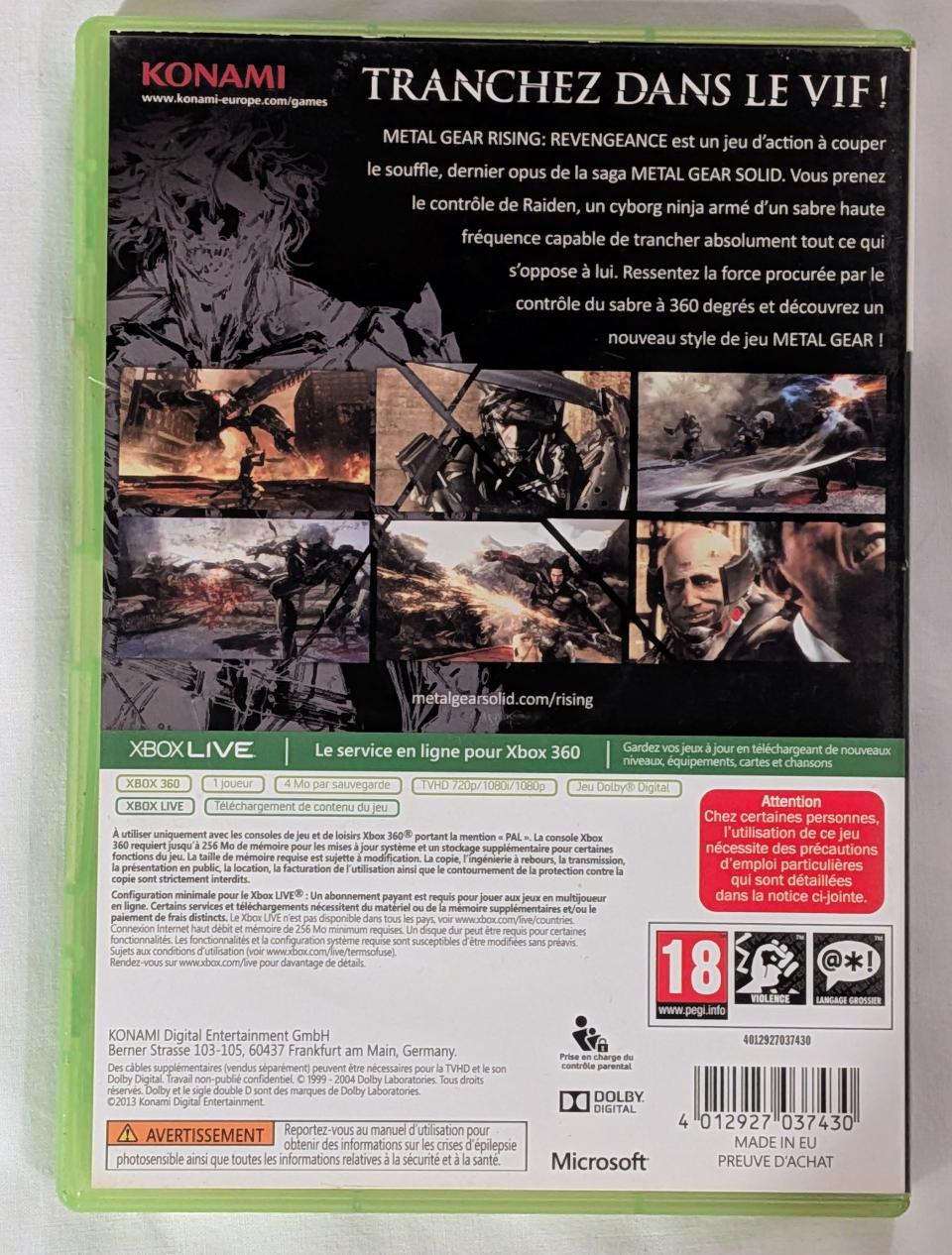 L3 - Metal Gear Rising - Revengeance Xbox 360 - EAN : 4012927037430 - ARTICLE OCCASION EN TRES BON ETAT GÉNÉRAL - TEST SUR CONSOLE ( Core , Elite , Arcade , 360 S , Xbox 360 E , SX ) OK - BOITIER ORIGINAL XBOX 360 - JEUX JOUABLE EN FRANCAIS - LIVRAISON ULTRA RAPIDE EN COLIS SUIVI PROTÈGE - COVER FR - COMPLET CIB