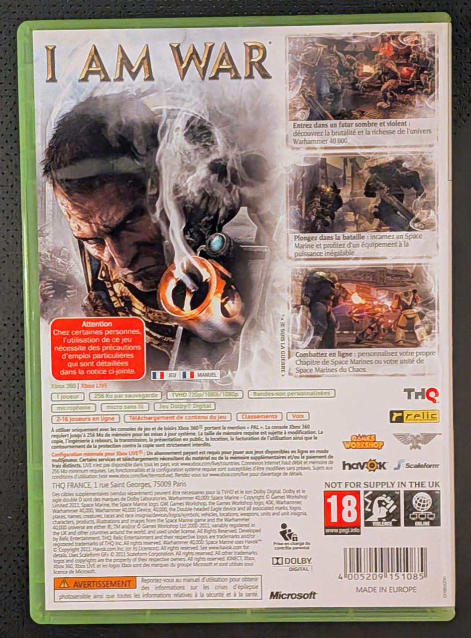 L3 - Warhammer 40000 - Space Marine Xbox 360 - EAN : 4005209151085 - ARTICLE OCCASION EN TRES BON ETAT GÉNÉRAL - TEST SUR CONSOLE ( Core , Elite , Arcade , 360 S , Xbox 360 E , SX ) OK - BOITIER ORIGINAL XBOX 360 - JEUX JOUABLE EN FRANCAIS - LIVRAISON ULTRA RAPIDE EN COLIS SUIVI PROTÈGE - COVER FR - COMPLET CIB