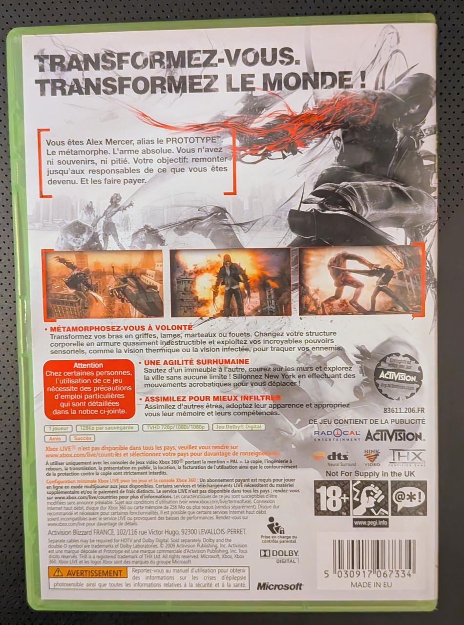L3 - Prototype Xbox 360 - EAN : 5030917067334 - ARTICLE OCCASION EN TRES BON ETAT GÉNÉRAL - TEST SUR CONSOLE ( Core , Elite , Arcade , 360 S , Xbox 360 E , SX ) OK - BOITIER ORIGINAL XBOX 360 - JEUX JOUABLE EN FRANCAIS - LIVRAISON ULTRA RAPIDE EN COLIS SUIVI PROTÈGE - COVER FR - COMPLET CIB