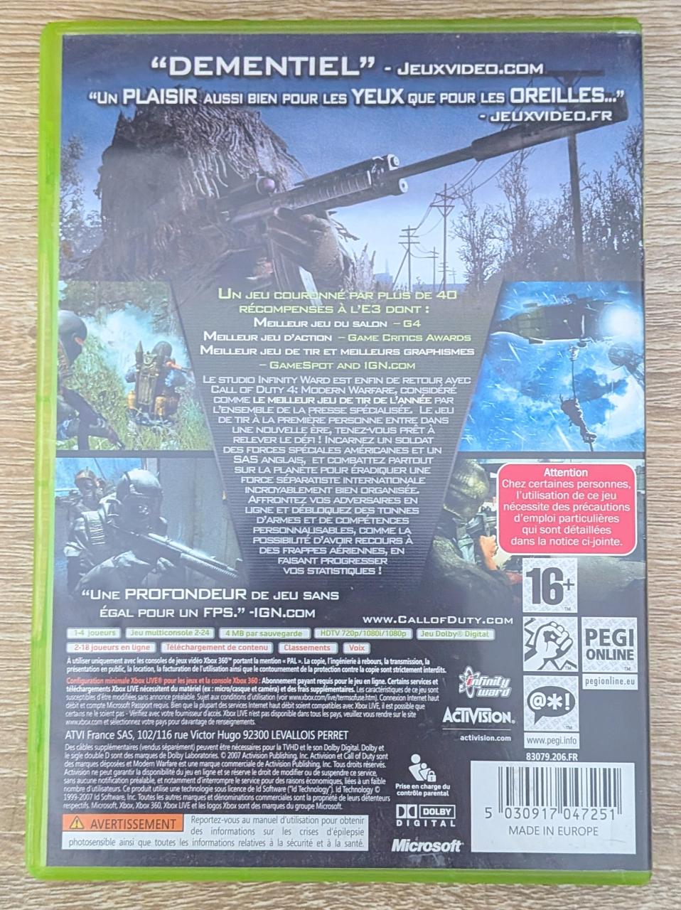 L1 - Call Of Duty 4 - Modern Warfare Xbox 360 - EAN : 5030917047251 - ARTICLE OCCASION EN TRES BON ETAT GÉNÉRAL - BOITIER ORIGINAL XBOX 360 - JEUX JOUABLE EN FRANCAIS - LIVRAISON ULTRA RAPIDE EN COLIS SUIVI PROTÈGE - COVER FR