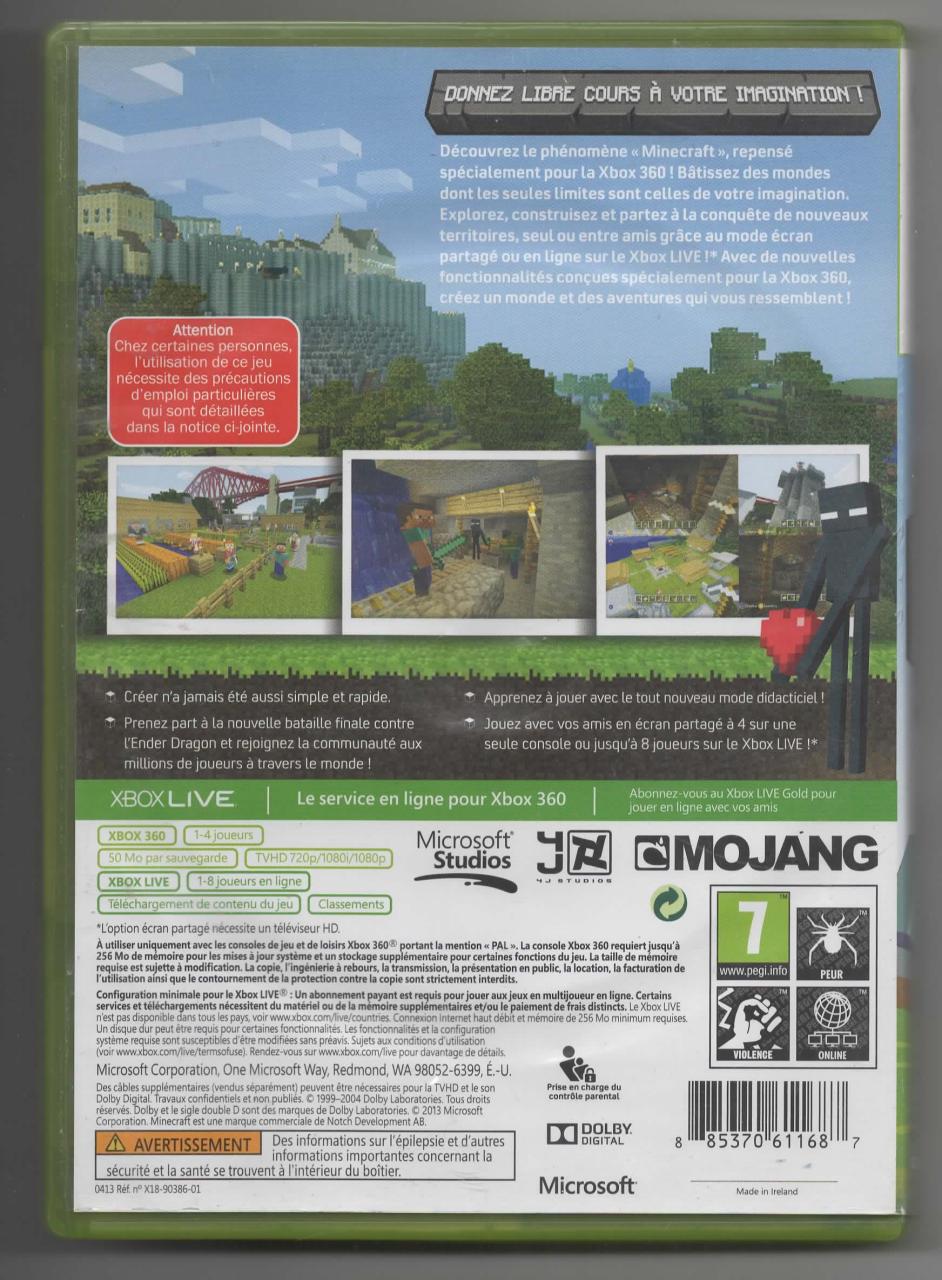 L1 - Minecraft Xbox 360 Edition - EAN : 885370611687 - ARTICLE OCCASION EN TRES BON ETAT GÉNÉRAL - TEST SUR CONSOLE ( Core , Elite , Arcade , 360 S , Xbox 360 E , Xbox SX ) BOITIER ORIGINAL XBOX 360 - JEUX JOUABLE EN FRANCAIS - LIVRAISON ULTRA RAPIDE EN COLIS SUIVI PROTÈGE - COVER FR - COMPLET CIB