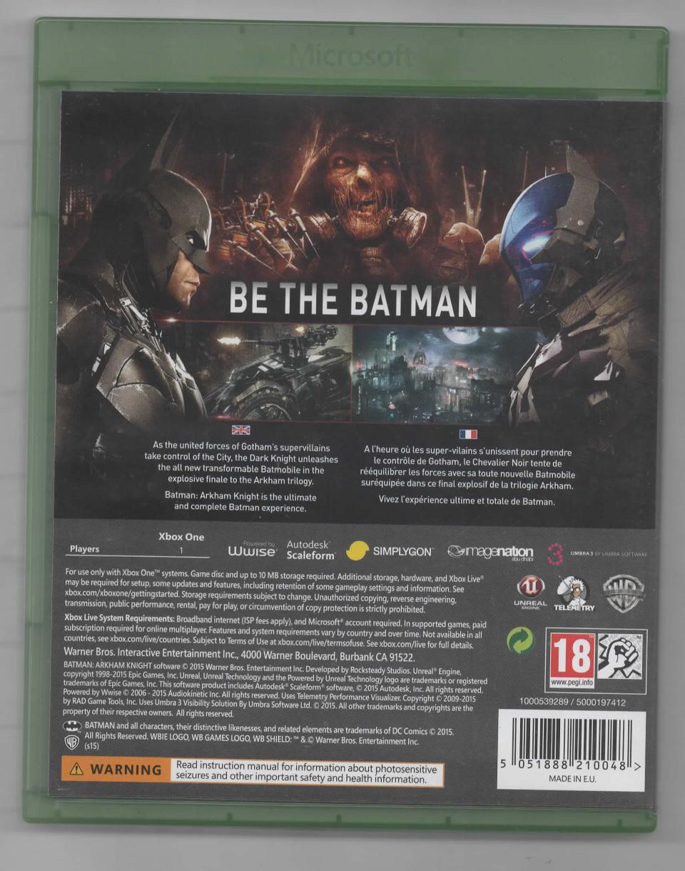 L2 - Batman Arkham Knight Xbox One - EAN : 5051888210048 - ARTICLE OCCASION EN TRES BON ETAT GÉNÉRAL - TEST SUR CONSOLE OK- BOITIER ORIGINAL XBOX SX - JEUX JOUABLE EN FRANCAIS - LIVRAISON ULTRA RAPIDE EN COLIS SUIVI PROTÈGE - COVER FR - COMPLET CIB