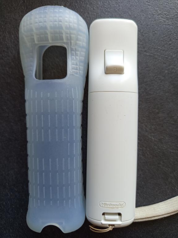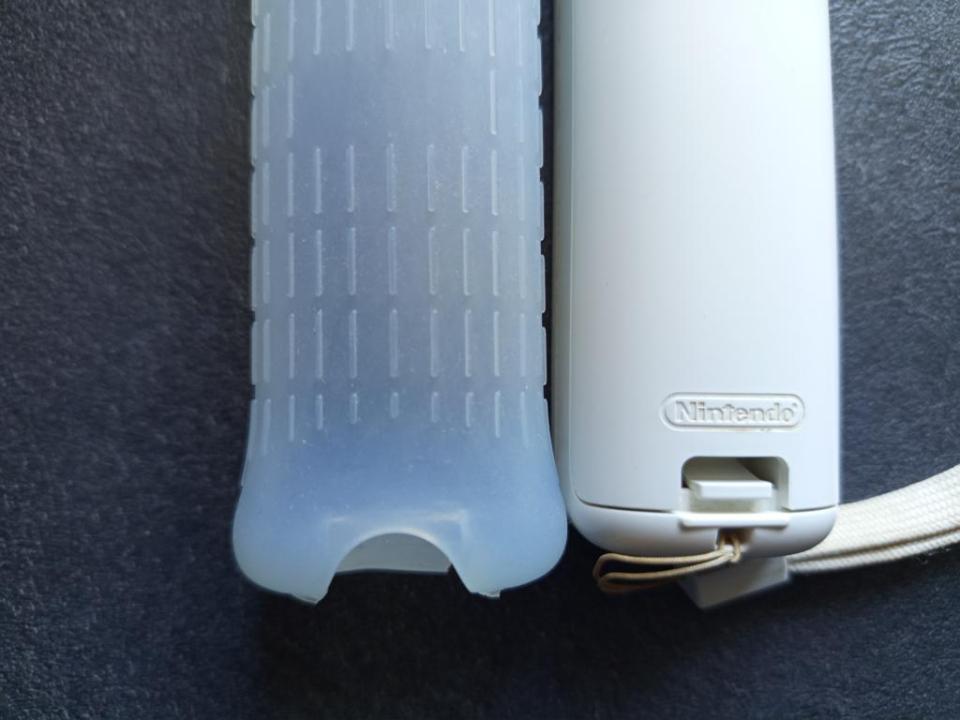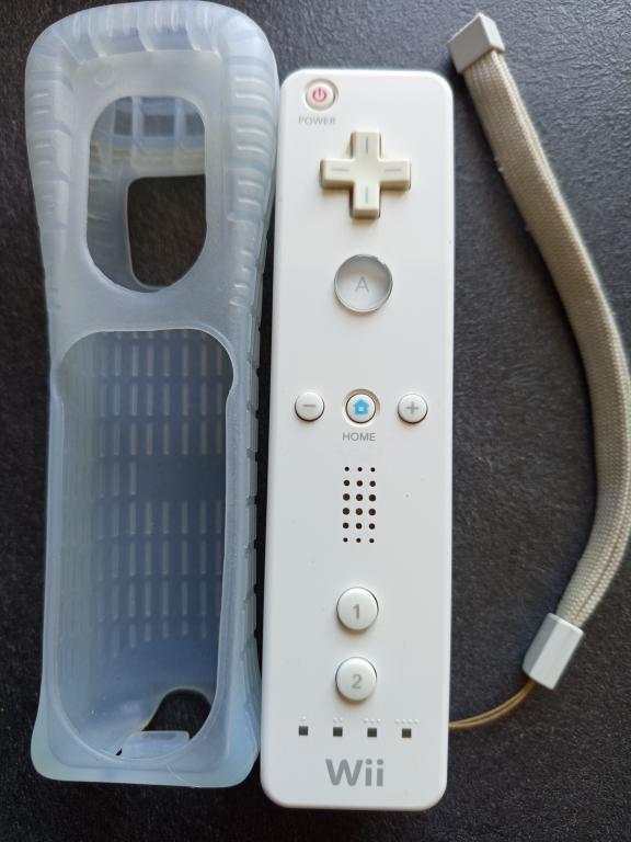 Wiimote vendue avec sa dragonne (officielle) et sa housse en silicone (non officielle).