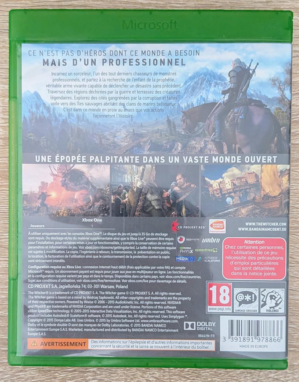 L2 - The Witcher 3 - Wild Hunt Xbox One - EAN : 3391891978866 - ARTICLE OCCASION EN TRES BON ETAT GÉNÉRAL - TEST SUR CONSOLE OK- BOITIER ORIGINAL XBOX ONE - JEUX JOUABLE EN FRANCAIS - LIVRAISON ULTRA RAPIDE EN COLIS SUIVI PROTÈGE - COVER E.U/FR - COMPLET CIB