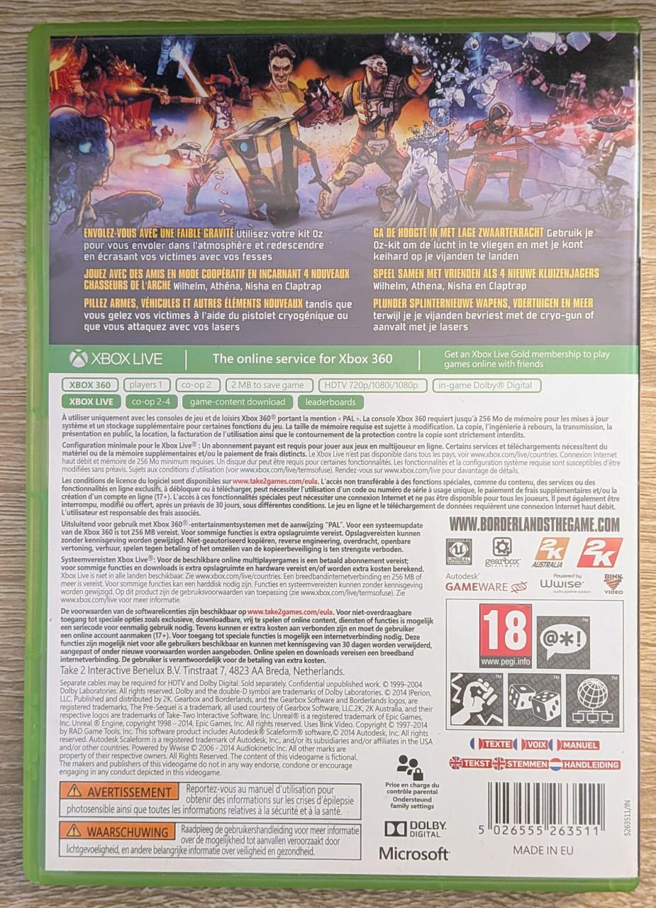 L1 - Borderlands : The Pre Sequel Xbox 360 - EAN : 5026555263511 - ARTICLE OCCASION EN TRES BON ETAT GÉNÉRAL - TEST SUR CONSOLE ( Core , Elite , Arcade , 360 S , Xbox 360 E , Xbox SX ) BOITIER ORIGINAL XBOX 360 - JEUX JOUABLE EN FRANCAIS - LIVRAISON ULTRA RAPIDE EN COLIS SUIVI PROTÈGE - COVER FR - COMPLET CIB