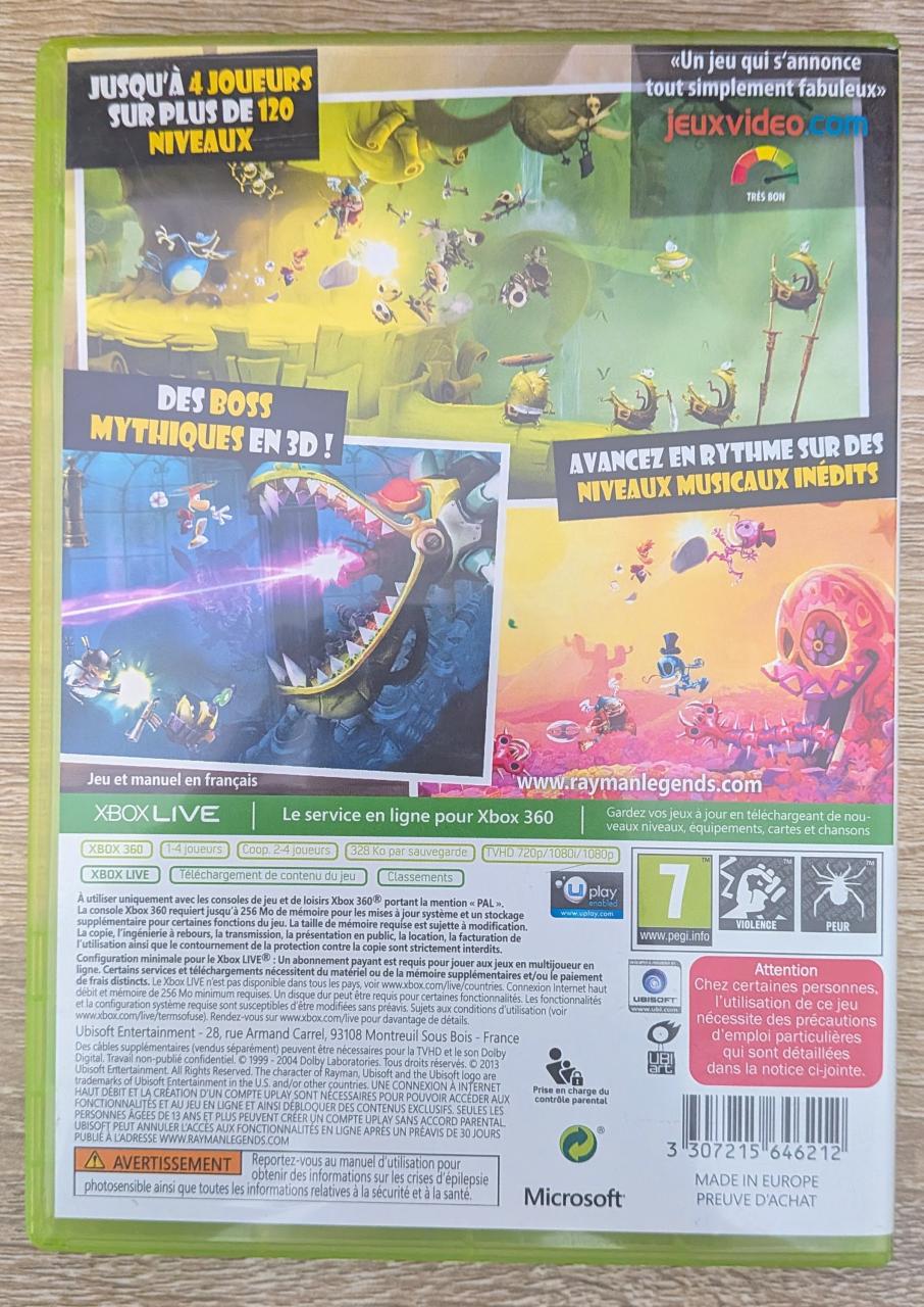 L2 - Rayman Legends Xbox 360 - EAN : 3307215646212 - ARTICLE OCCASION EN TRES BON ETAT GÉNÉRAL - TEST SUR CONSOLE ( Core , Elite , Arcade , 360 S , Xbox 360 E , Xbox SX ) BOITIER ORIGINAL XBOX 360 - JEUX JOUABLE EN FRANCAIS - LIVRAISON ULTRA RAPIDE EN COLIS SUIVI PROTÈGE - COVER FR - COMPLET CIB
