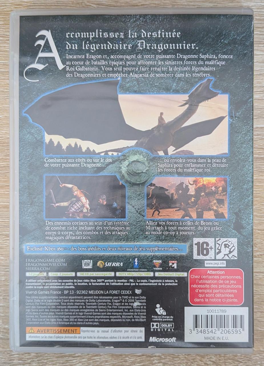 L2 - Eragon Xbox 360 - EAN : 3348542206595 - ARTICLE OCCASION EN TRES BON ETAT GÉNÉRAL - TEST SUR CONSOLE ( Core , Elite , Arcade , 360 S , Xbox 360 E , Xbox SX ) BOITIER CRYSTAL CASE - JEUX JOUABLE EN FRANCAIS - LIVRAISON ULTRA RAPIDE EN COLIS SUIVI PROTÈGE - COVER FR