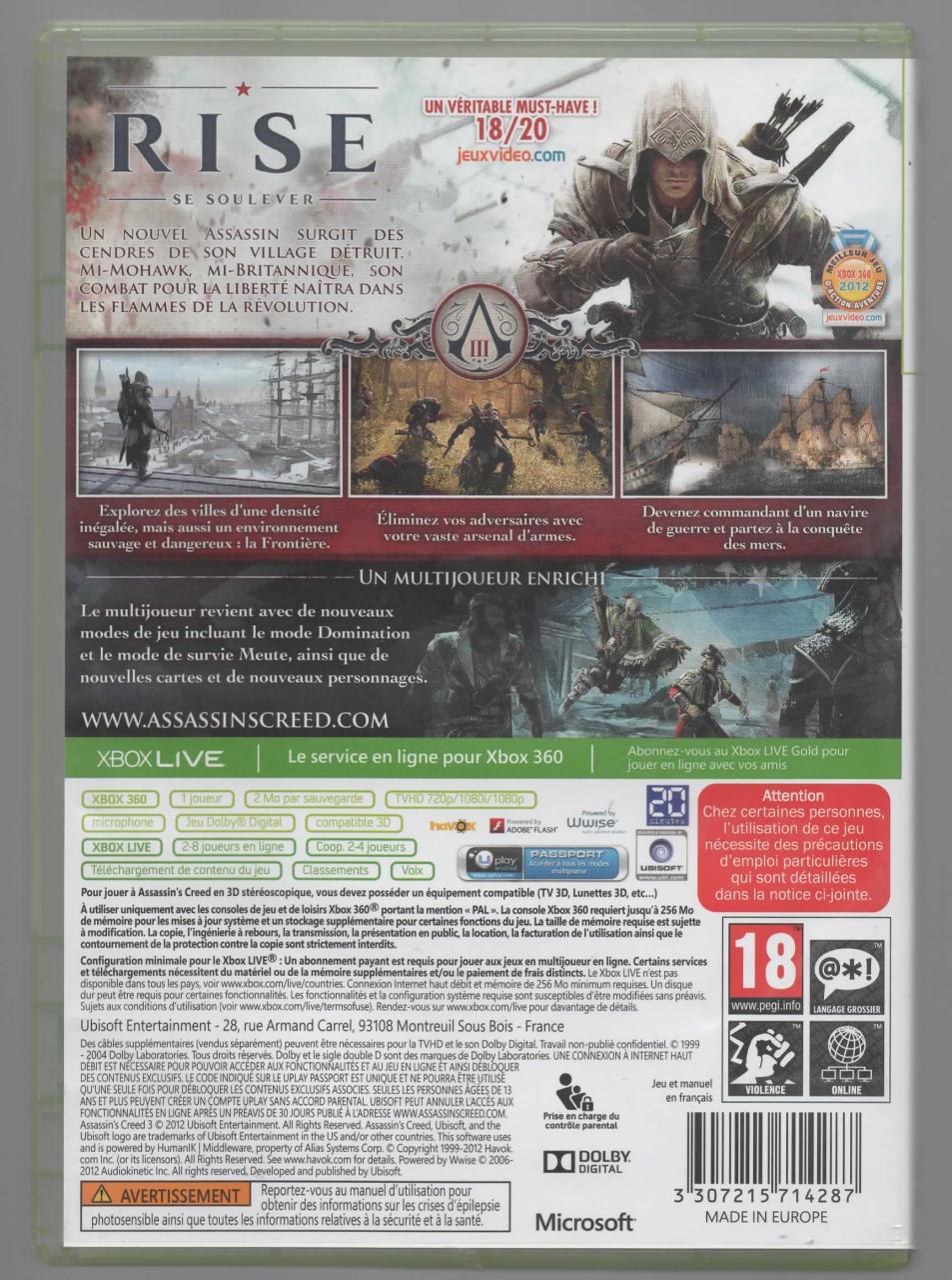 L2 - Assassin's Creed 3 Xbox 360 - EAN : 3307215714287 - ARTICLE OCCASION EN TRES BON ETAT GÉNÉRAL - TEST SUR CONSOLE ( Core , Elite , Arcade , 360 S , Xbox 360 E , Xbox SX ) BOITIER ORIGINAL XBOX 360 - JEUX JOUABLE EN FRANCAIS - LIVRAISON ULTRA RAPIDE EN COLIS SUIVI PROTÈGE - COVER FR - COMPLET CIB