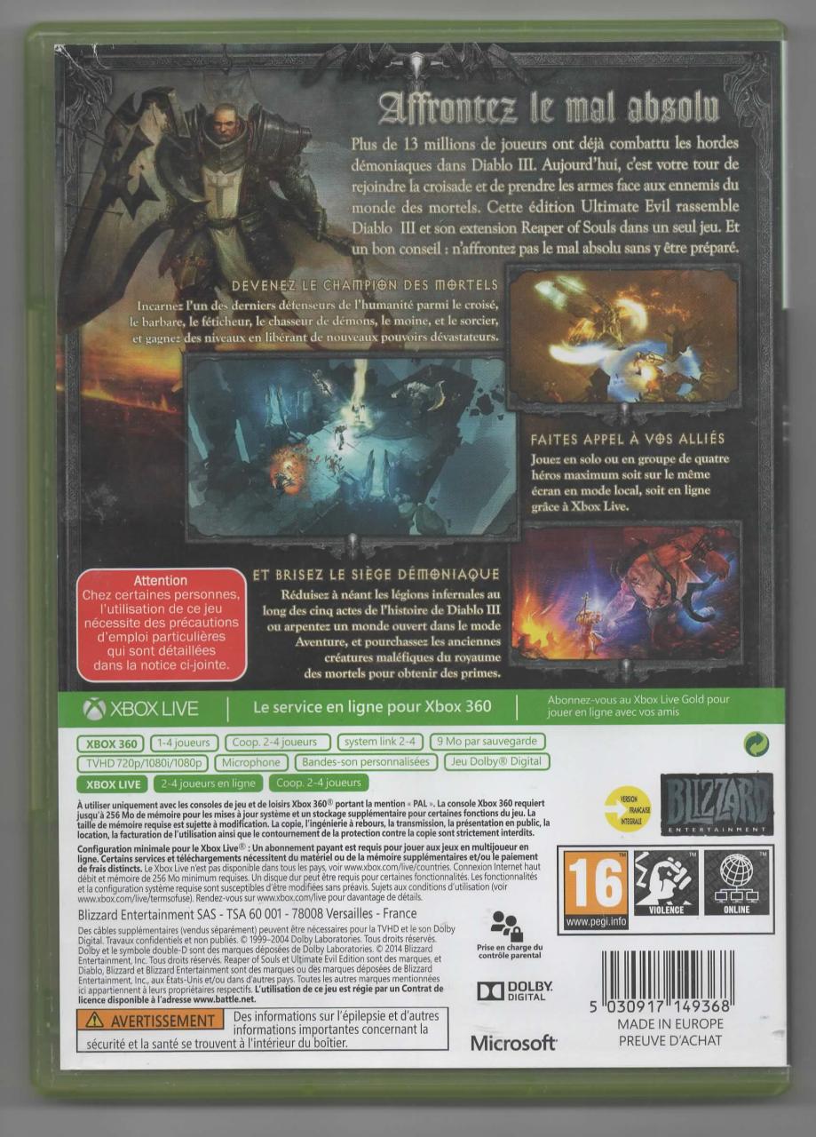 L2 - Diablo 3 - Reaper Of Souls - Ultimate Evil Edition Xbox 360 - EAN : 5030917149368 - ARTICLE OCCASION EN TRES BON ETAT GÉNÉRAL - TEST SUR CONSOLE ( Core , Elite , Arcade , 360 S , Xbox 360 E , Xbox SX ) BOITIER ORIGINAL XBOX 360 - JEUX JOUABLE EN FRANCAIS - LIVRAISON ULTRA RAPIDE EN COLIS SUIVI PROTÈGE - COVER FR - COMPLET CIB