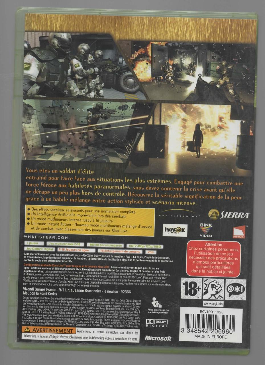 L2 - F.E.A.R. Xbox 360 - EAN : 3348542206960 - ARTICLE OCCASION EN TRES BON ETAT GÉNÉRAL - TEST SUR CONSOLE ( Core , Elite , Arcade , 360 S , Xbox 360 E , Xbox SX ) BOITIER ORIGINAL XBOX 360 - JEUX JOUABLE EN FRANCAIS - LIVRAISON ULTRA RAPIDE EN COLIS SUIVI PROTÈGE - COVER FR - COMPLET CIB
