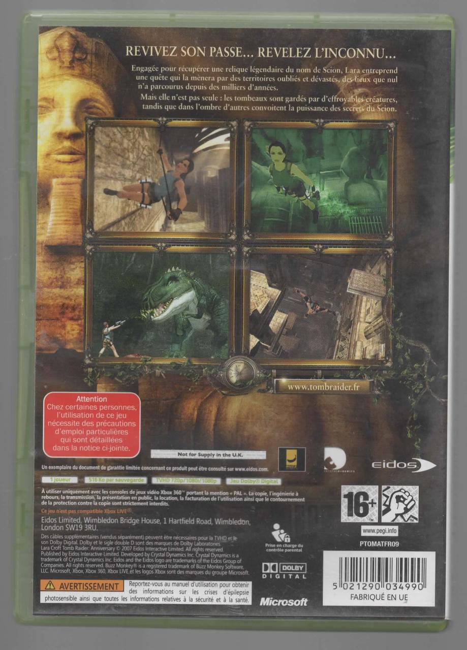 L3 - Lara Croft Tomb Raider Anniversary Xbox 360 - EAN : 5021290034990 - ARTICLE OCCASION EN TRES BON ETAT GÉNÉRAL - TEST SUR CONSOLE ( Core , Elite , Arcade , 360 S , Xbox 360 E ) OK - BOITIER ORIGINAL XBOX 360 - JEUX JOUABLE EN FRANCAIS - LIVRAISON ULTRA RAPIDE EN COLIS SUIVI PROTÈGE - COVER E.U - COMPLET CIB